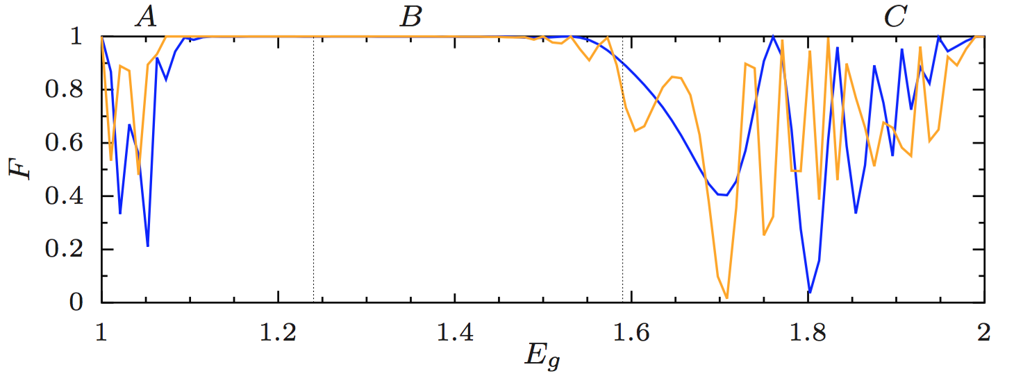 Figure: Fidelity of the spatial adiabatic passage for two interacting bosons as a function of their interaction. From the non-interacting case (Eg = 1) to the Tonks-Girardeau limit (Eg = 2). Blue and orange curves represent total times T = 4000 and T = 12000, respectively.