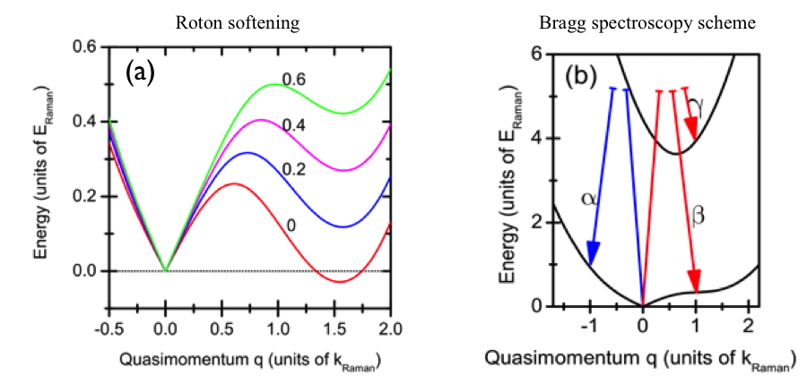 Figure: The left shows the roton softening for different Raman detunings and the right panel the schematic explaining the Bragg spectroscopy technique.
