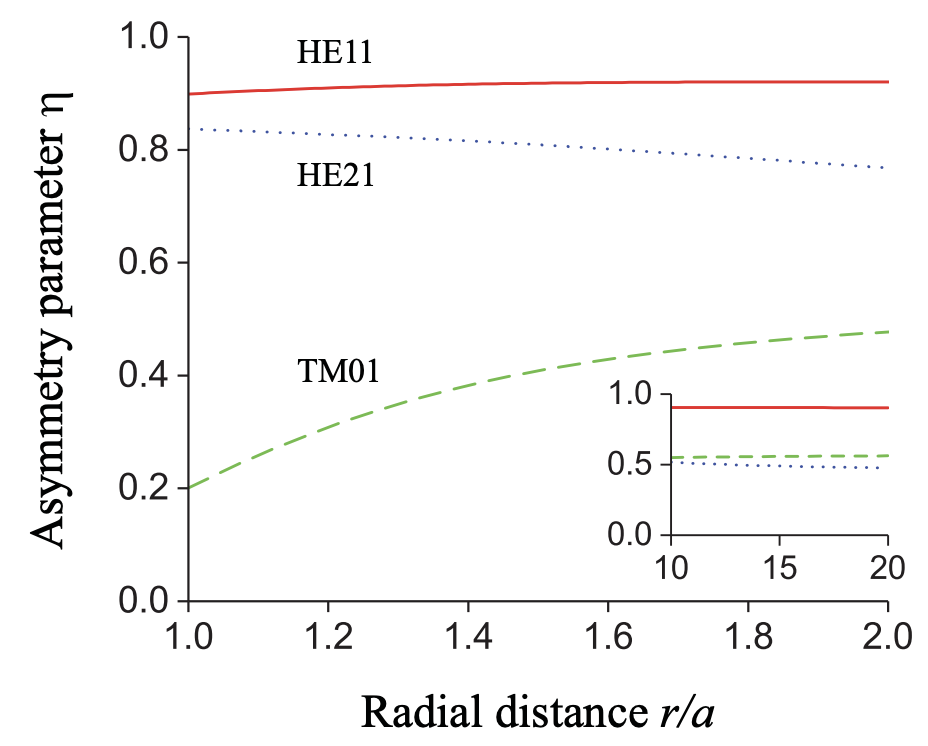 Figure: Radial dependence of the asymmetry parameter for the axial forces for the opposite propagation directions along the fibre. The inset shows the asymmetry in the limit of large distances from the fibre surface.
