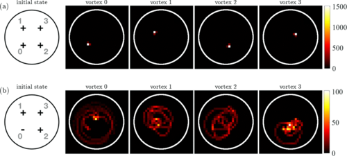 Figure: Histograms of the positions of each vortex in the x-y plane, tracked over an evolution time of 20 s in the corotating frame. The vortex in the lower left has been annihilated by phase imprinting and reimprinted with (a) the same and (b) the opposite direction of rotation, exactly on the vortex core. (a) For four vortices with the same circulation direction, regular trajectories at constant radius appear, while in panel (b), disordered vortex trajectories can be seen.