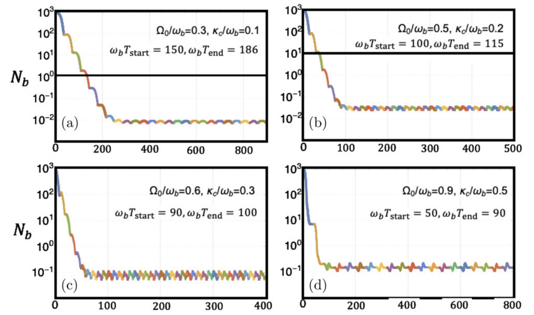 Figure: Comparison between optomechanical cooling using iterated STIRAP truncated pulses and standard sideband cooling. Multicoloured curves show phonon occupancy using STIRAP cooling for various parameters. The horizontal black solid line (wherever shown), depicts the steady-state phonon number obtained from normal sideband optomechanical cooling while in other cases normal optomechanical cooling is not possible due to instability in the system.