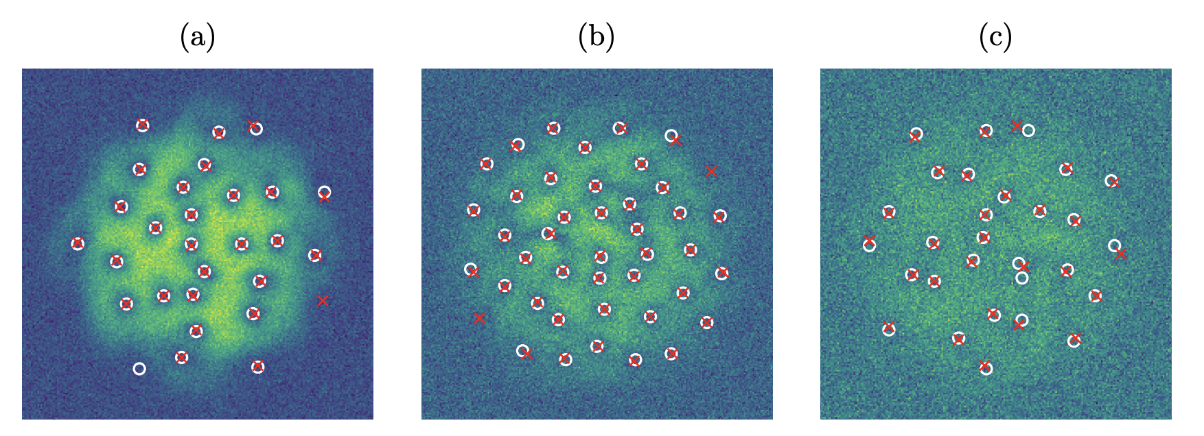 Figure: The locations of the vortex cores within each image are indicated by red crosses for the model prediction and by white circles for the ground truth obtained through the brute-force detection method. The CNN model was trained and tested only on BEC density images and therefore does not have access to the information encoded in the phase profile. (a), (b) and (c) show examples of BEC density configurations to which random Gaussian noise is added with growing standard deviations from left to right (σ = 0.1, 0.2, 0.5).