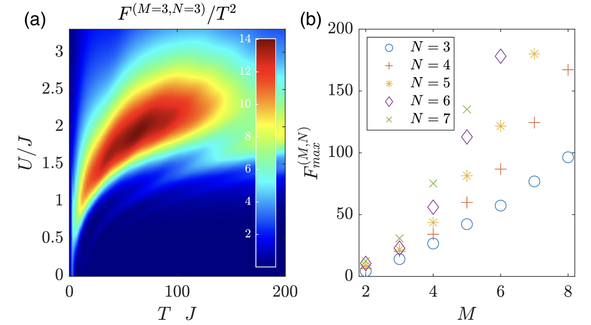 Figure: (a) Density plot of the scaled Fisher information as a function of the free parameters. (b) Growth of the maximum of the Fisher information as a function of number of modes and particles.