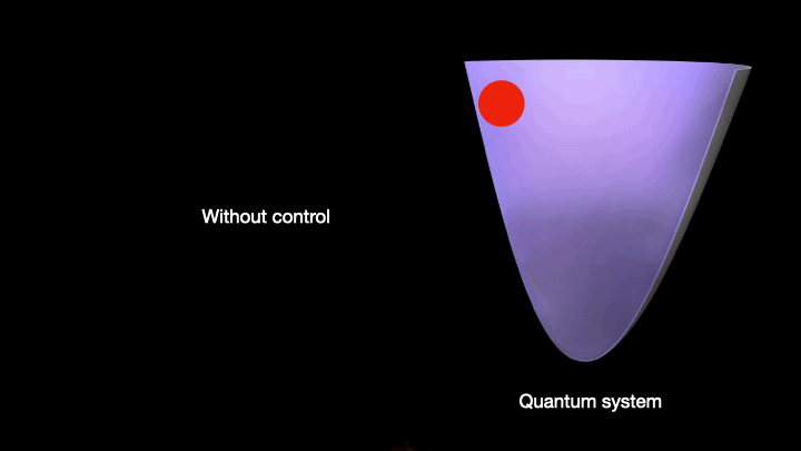 The basic idea is to achieve quantum control through the application of the AI agent (left). For instance, to cool the quantum ball (red) down to the bottom of the well in presence of environmental noises, the AI controller, which is based on reinforcement learning, would identify intelligent control pulses (middle polar graph).