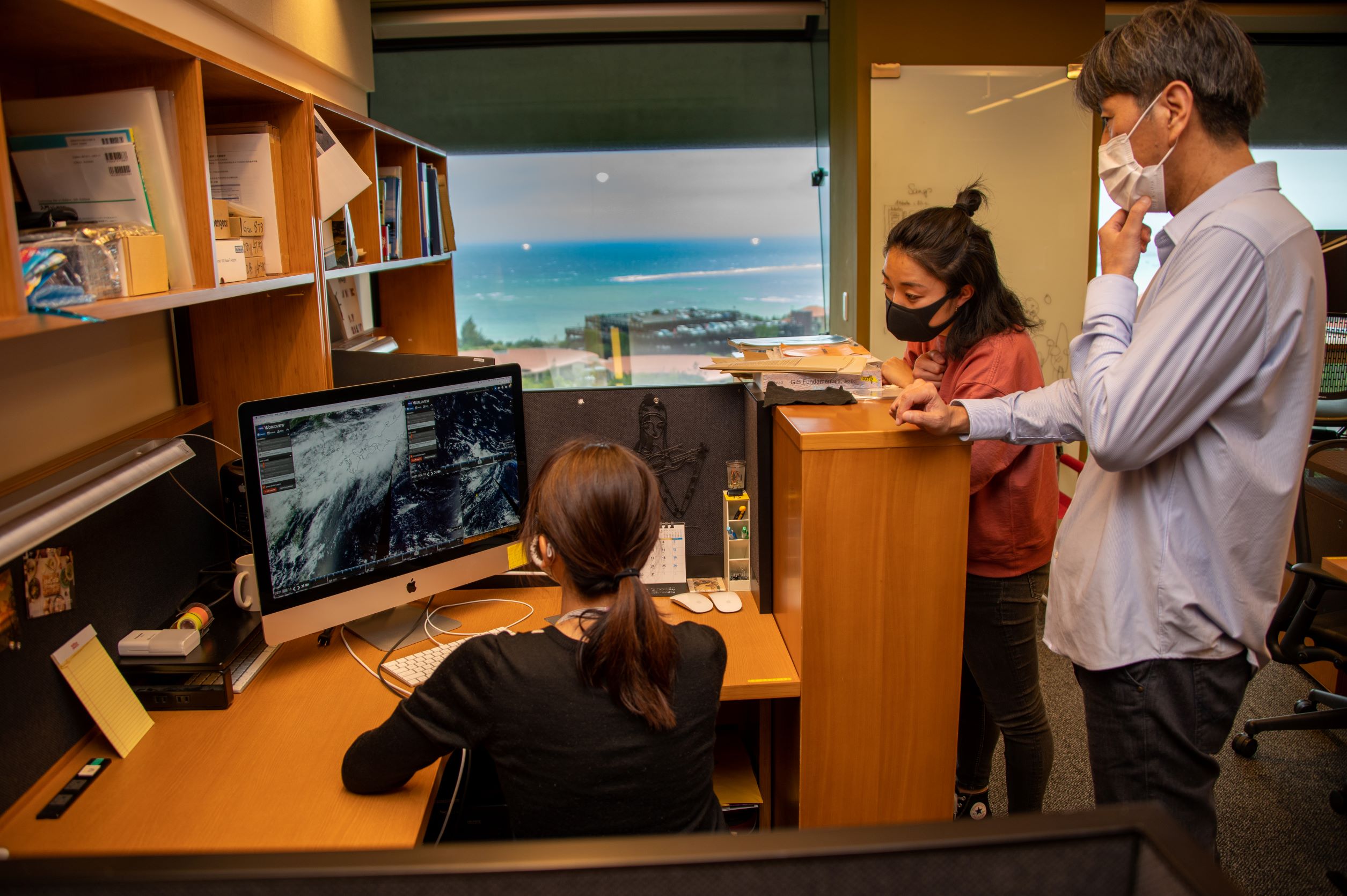 Research Assistant Kazumi Inoha shows simulations of the path of the pumice following the August eruption.