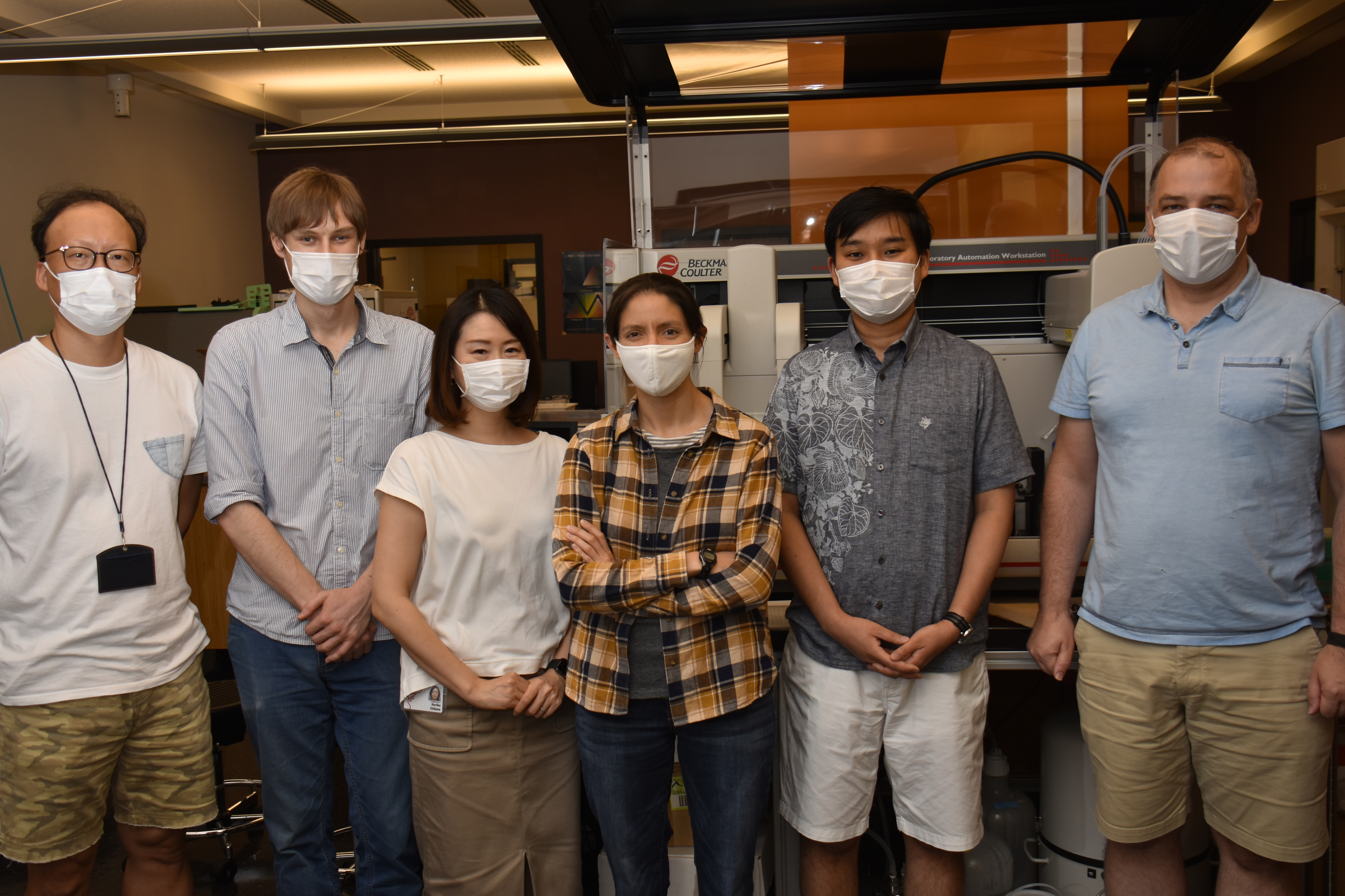 The scientists and staff who have worked hard for the OIST antibody test. From left, Dr. Tae Gyun Kim, Christian Butcher, Noriko Shibata, Dr. Melissa Matthews, Dr. Satoshi Shibata, and Prof. Matthias Wolf.