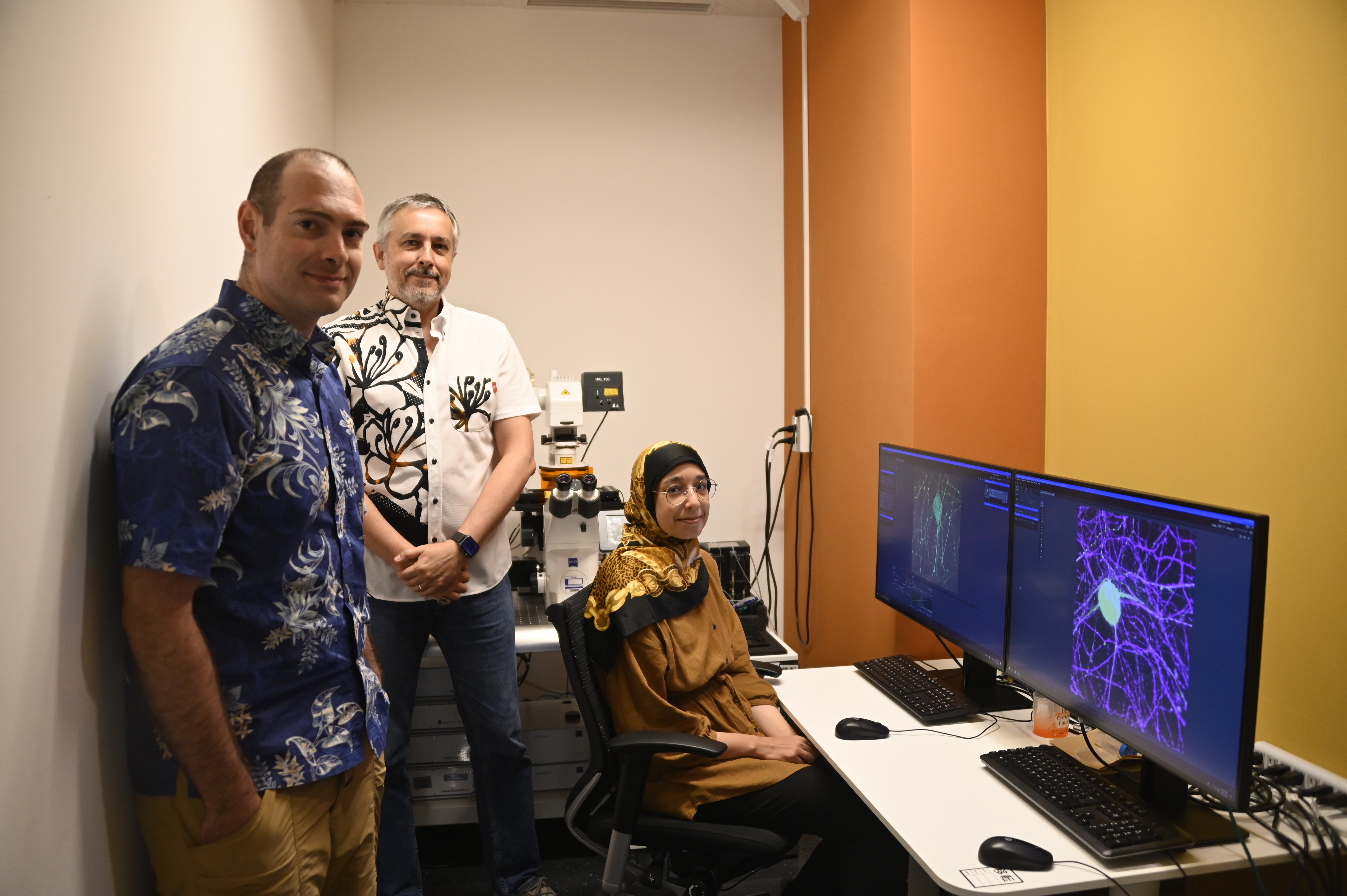 OIST researchers involved in this study. From left to right: Prof. Marco Terenzio, Dr. Laurent Guillaud, and Sara Emad El-Agamy.