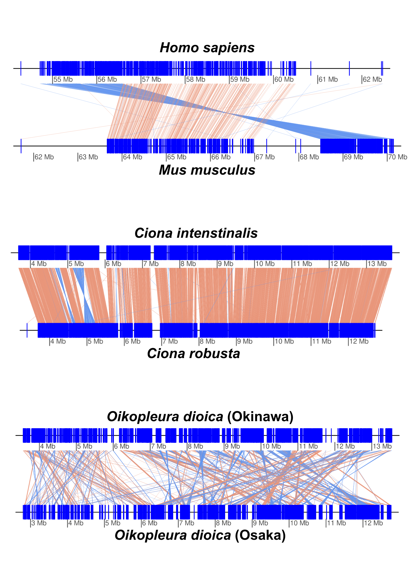 Ribbon charts comparing chromosomes across species: human vs. house mouse, two species of Ciona sea squirts, and two Oikopleura dioica lineages. Black lines depict chromosomes, lengths measured in megabase pairs (Mb), here used to indicate the coordinates of the genes on the chromosomes. Blue boxes represent matching regions between chromosomes. Orange ribbons denote matches with the same gene order, while blue ribbons indicate reversed order. Credit: Charles Plessy (OIST)