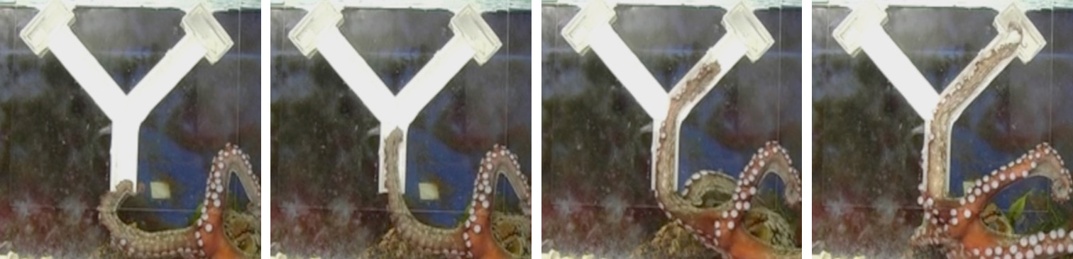 The researchers taught octopuses to insert their arms down the left or right side tubes of Y-shaped mazes. Both sides of the maze were baited with food, but food on the incorrect side was blocked by a net. Here, an octopus correctly picks the right side tube and grabs a food reward.