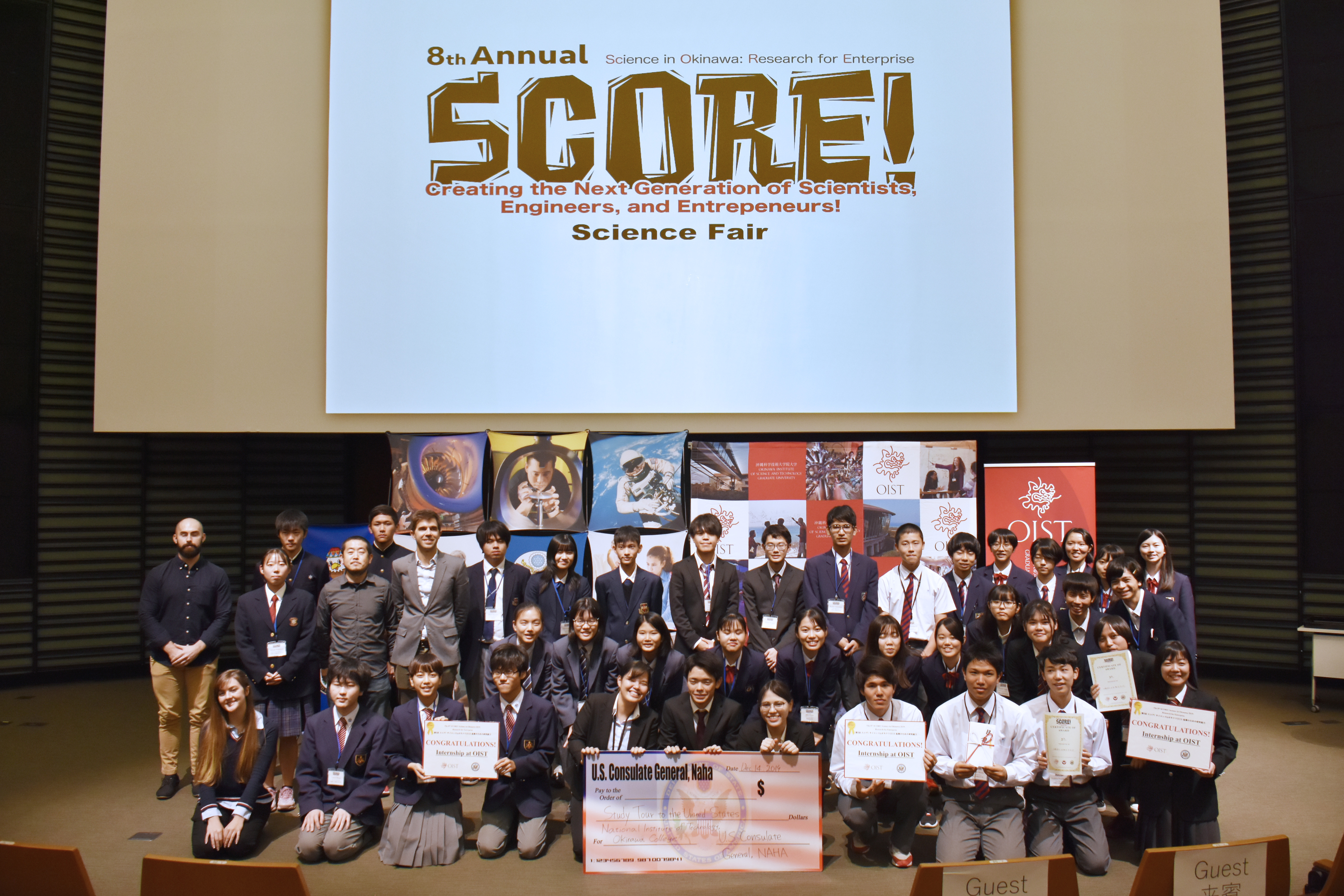 Students in front of a screen projected "SCORE!" text
