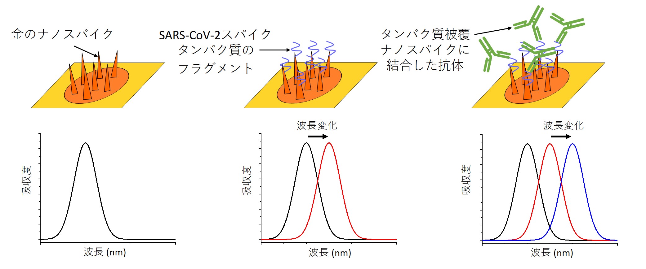 The wavelength of light absorbed by the nanospikes changes depending on its local environment. The principle is the basis for detecting the presence and quantity of antibodies which are bound to the protein-covered nanospikes.