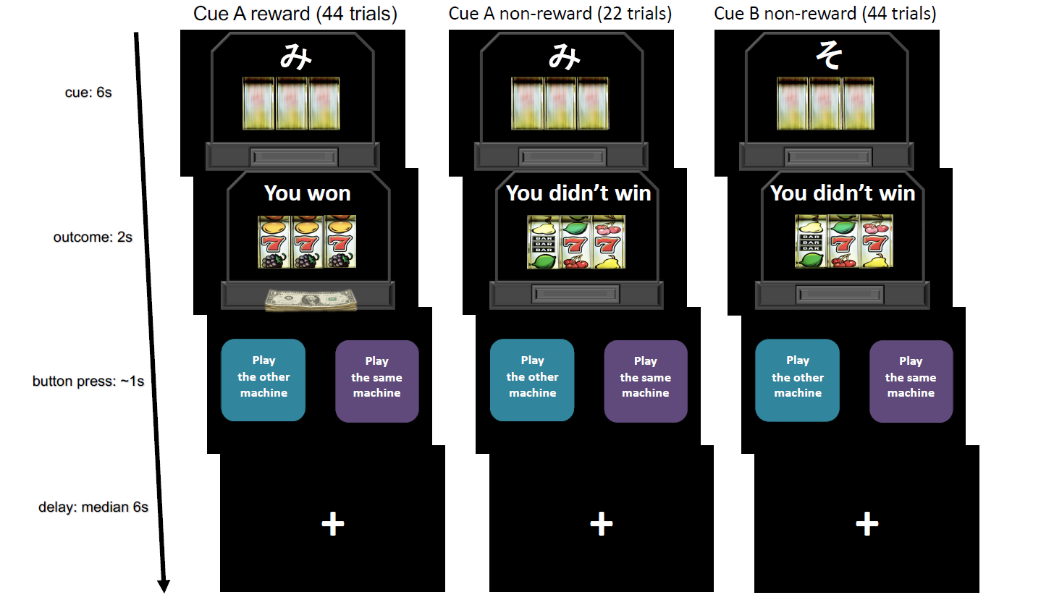 When the slot machine showed Cue A – the Japanese character み (mi) – participants received money 66% of the time. When the slot machine showed Cue B – the Japanese character そ (so) – the participants did not receive any money.