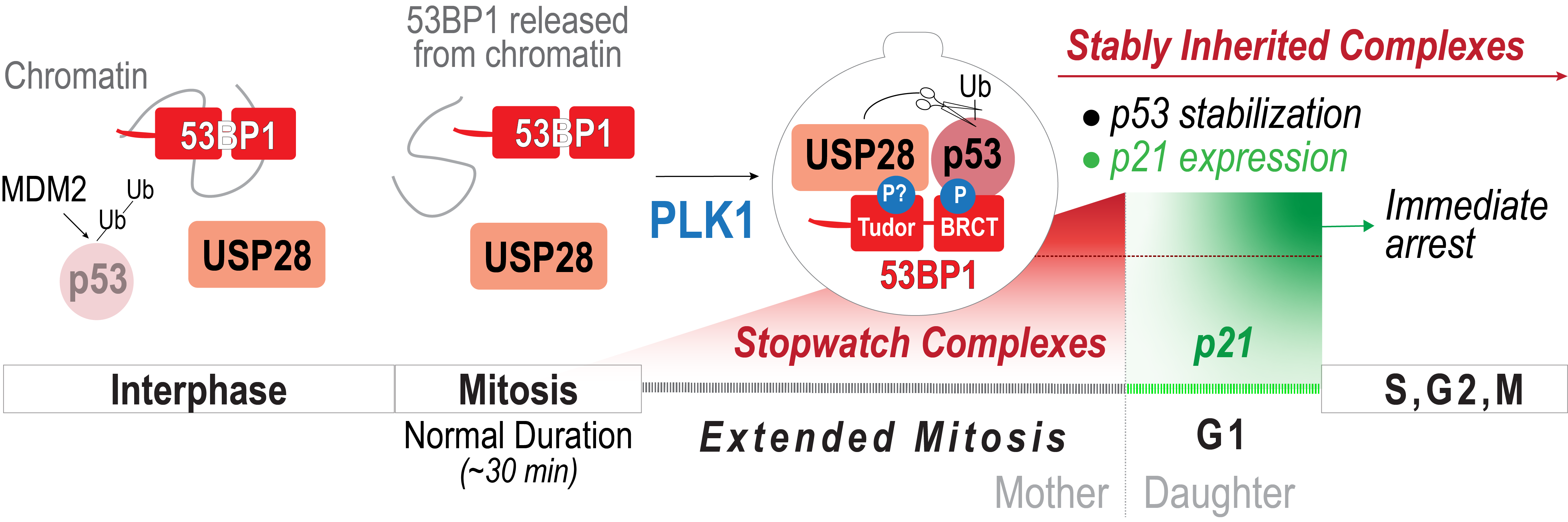 During an extended mitosis PLK1 triggers the formation of a Mitotic Stopwatch Complex that stabilizes and activates the tumor suppressor p53. This complex accumulates during one or successive prolonged mitoses and ultimately causes cell arrest or cell death.