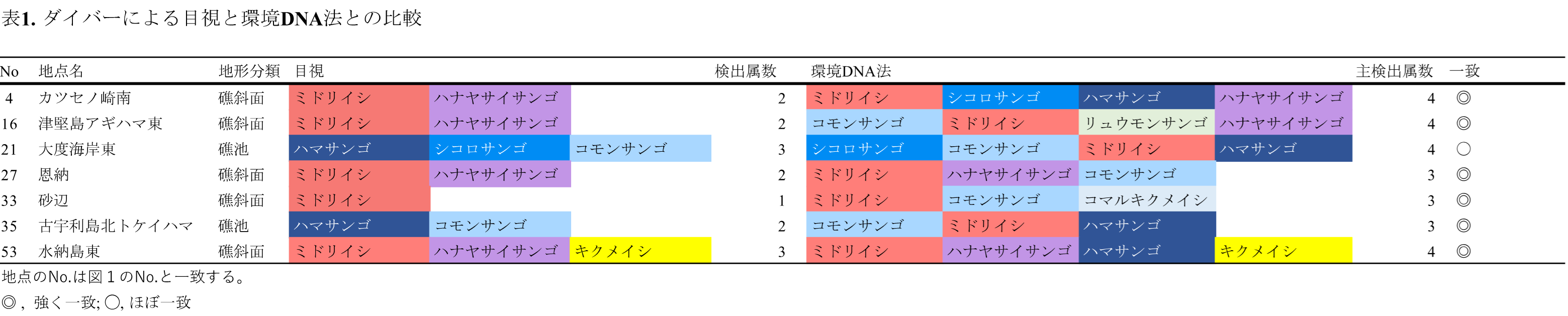 表1.ダイバーによる直接観察と環境DNA解析法の結果の比較。左の地点番号は図2の地点番号と同じである。観察地点名とサンゴ礁の地形的特徴を示した。次は目視によって同定された優占属、さらに環境DNA法によって同定された属を、そして両者の結界の比較を右端に示した。