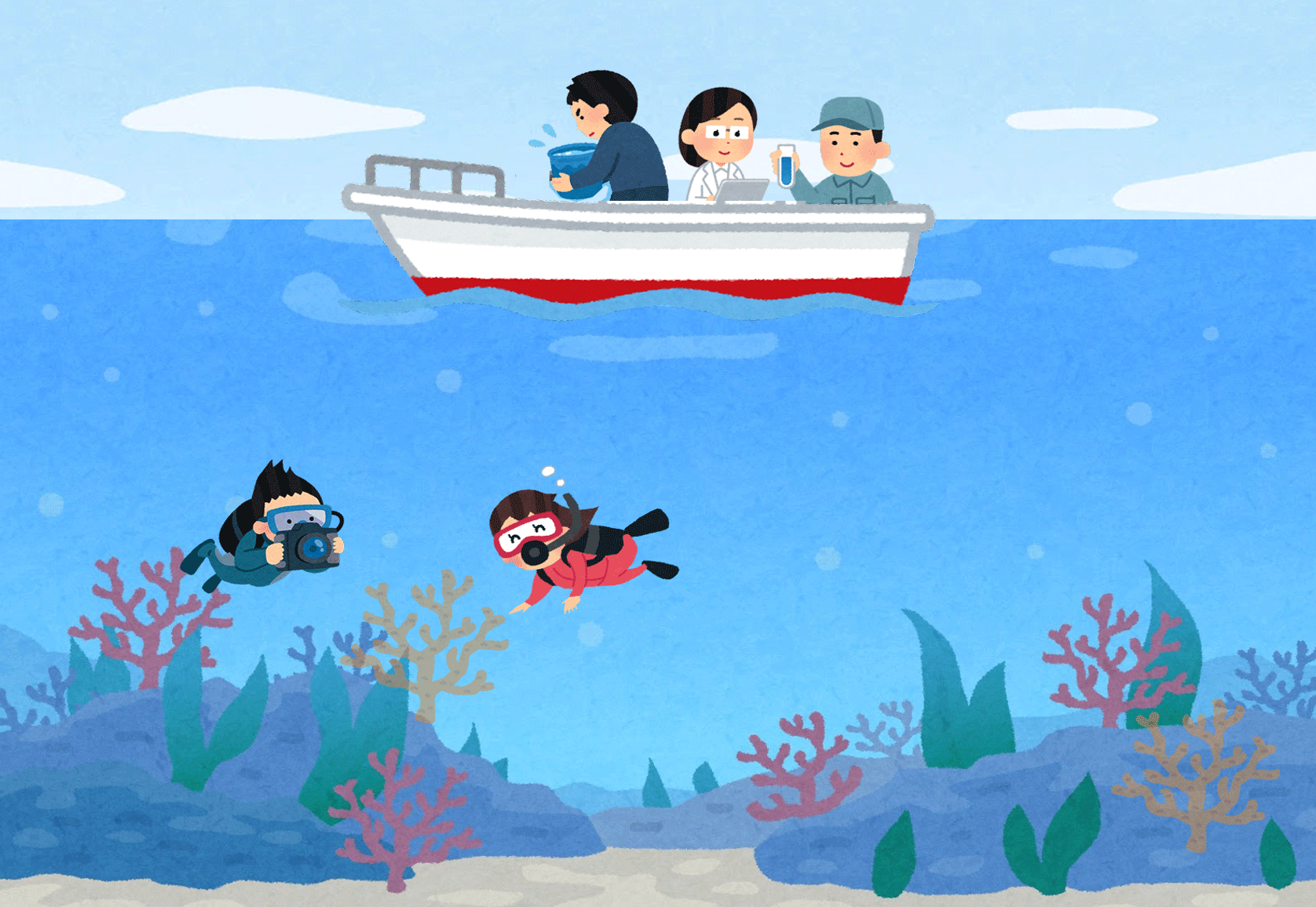 同時観察調査のイメージ。海中でのダイバーによる直接目視観察と船上での表面海水からの環境DNAの採集を同時に行い、その結果を比較した。