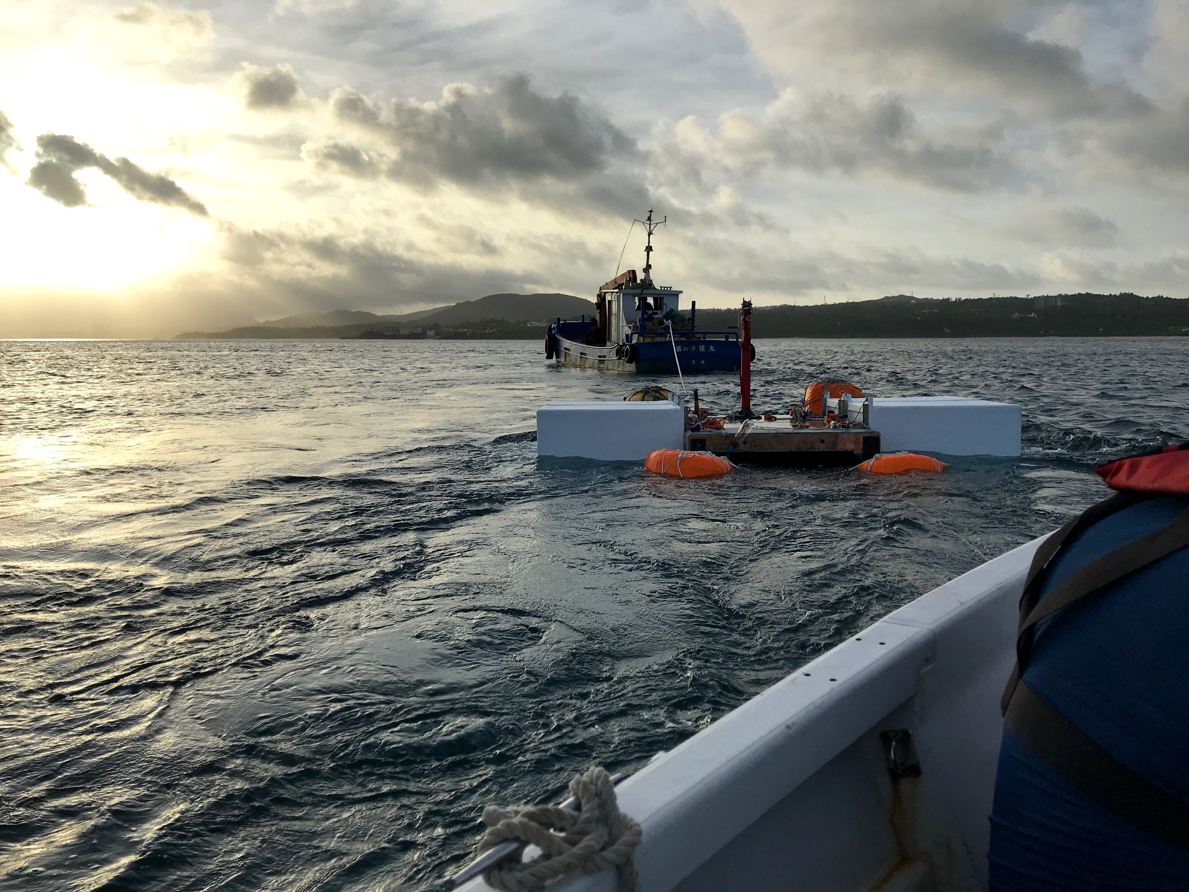 The turbine, waveguide, and supporting concrete block are dragged around the coast by speedboat. The team next had to wait for low tide so that the unit could land on the seabed.