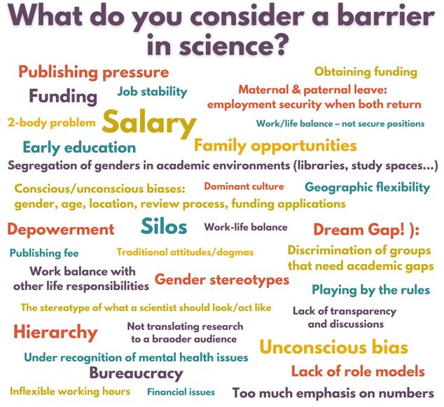 "The question "What do you consider a barrier in science?" elicited a wide range of opinions. Unconscious bias, hierarchy, gender stereotypes, lack of role models, etc. were mentioned during the session.