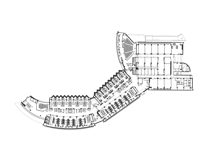センター棟は、第1、第2、第3研究棟を繋ぐ中心の役割を果たすとともに、トンネルギャラリーからOISTへの入口となるエントランスとして機能するように設計されました。来訪者はトンネルギャラリーを進んでいくと、その先に設置されているエレベーターで3つの階に上がることができます。 センター棟の1階にあたるA階には、管理部門のオフィスが設置されています。2階にあたるB階には、図書館、2つの大型セミナールーム、保健センター、クリニックなどがあります。最上階のC階には、芝生で覆われた開放的なセンターコートがあり、OISTで初期に建設された施設のまさに中心となっています。第1から第3研究棟までが連結しているセンター棟のC階には、2つのセミナールームの他にカフェが設置されており、その屋外席がセンターコートに用意されています。カフェなどの C階の一部施設は一般の方も利用することができます。