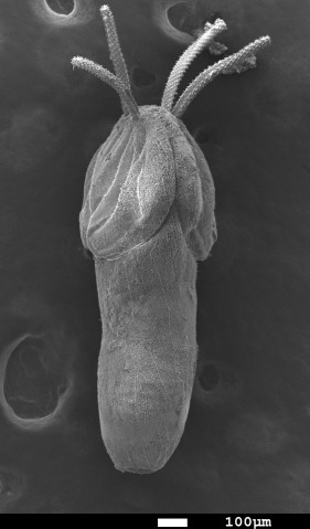 条虫類Nybelinia enterika の走査電子顕微鏡(SEM:Scanning Electron Microscope)写真 。