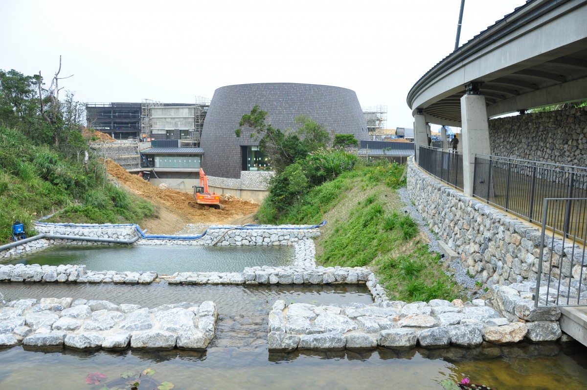 現在建設中の新しい講堂をOISTキャンパス建設セクションの日高靖晃セクションリーダーはこのように表現します。これまで建物を覆っていた足場が徐々に撤去され、完成間近の500名収容の講堂が姿を現しました。講堂の設計は、国内最大手の一つ、日建設計と、地元設計会社の国建によって手がけられました。講堂のこけら落としは本年4月となる予定です。