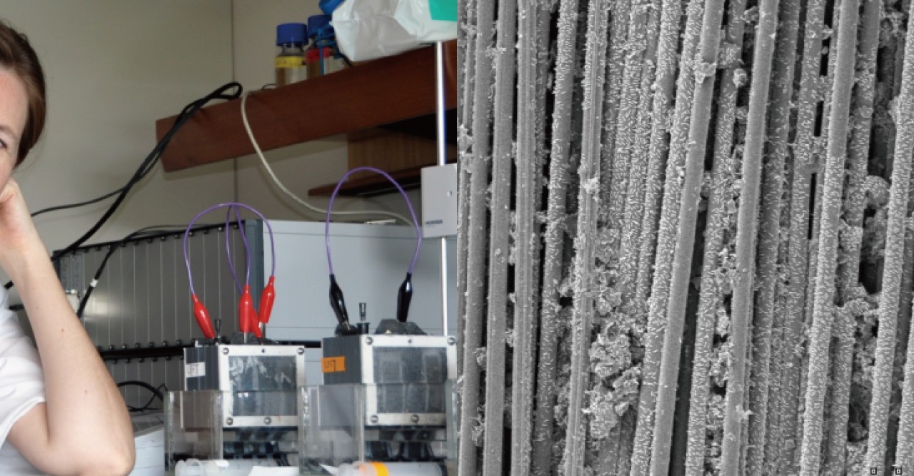 生物システムユニットでは、微生物燃料電池の研究を行っています。微生物燃料電池はバクテリアが廃棄物を分解して発電するプロセスです。キセレバ博士によれば、「通常の燃料電池には高価な燃料とさらに高価な触媒が必要」とのことです。触媒は化学反応を引き起こす物質で、燃料電池の場合には、化学反応により電流が発生します。一方、微生物燃料電池の場合、触媒作用はバクテリアが受け持ち、そのバクテリアが必要とする燃料は通常の燃料ではなく、廃棄物です。