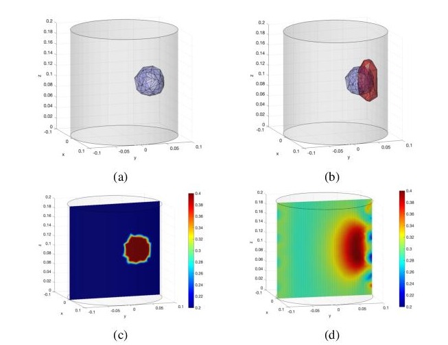 新しい方法を検証するために、研究チームは腫瘍の位置が既知である例をシミュレートし、電気インピーダンス・トモグラフィ(EIT)と偏微分方程式の最適制御理論を用い、腫瘍の位置をどの程度正確に特定できるかを試した。 (a) がん性腫瘍の実際の位置、 (b) 再構成画像と腫瘍の実際の位置、 (c) 実際のがん性腫瘍の断面、 (d) 腫瘍の再構成断面。
