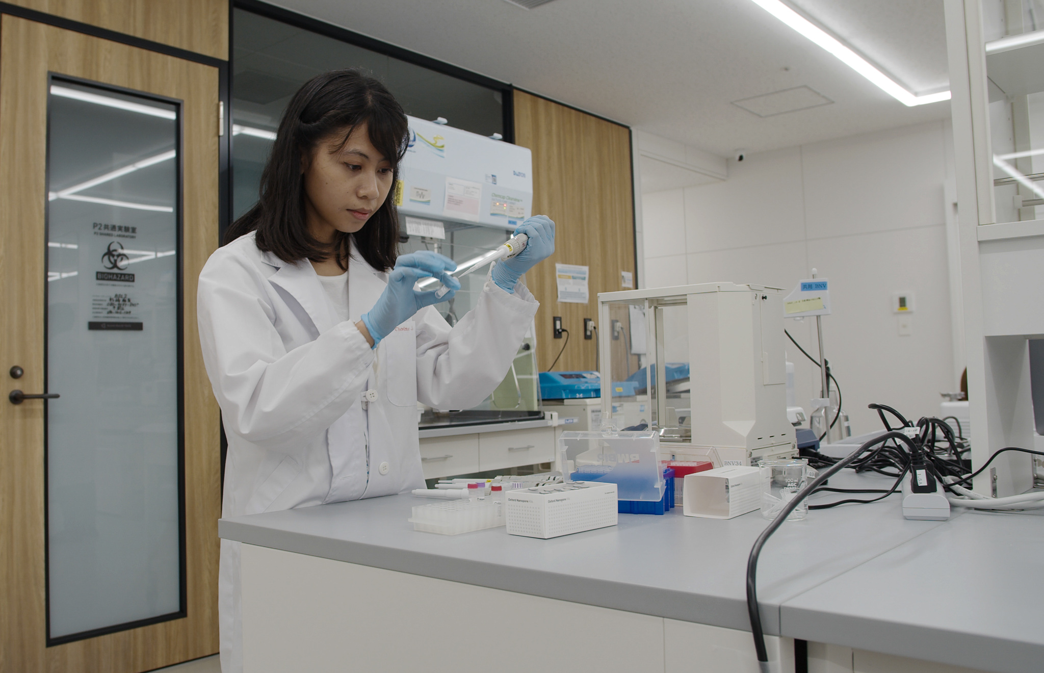 OISTの研究室でサンプルを分析するスタートアップ企業Tupac.Bio のCharlane Joy Cardosさん。Tupac.Bioは、新たな事業分野GenomeMinerで2021年度のイノベーションスクエア・スタートアップアクセラレータープログラムの支援を受けている。