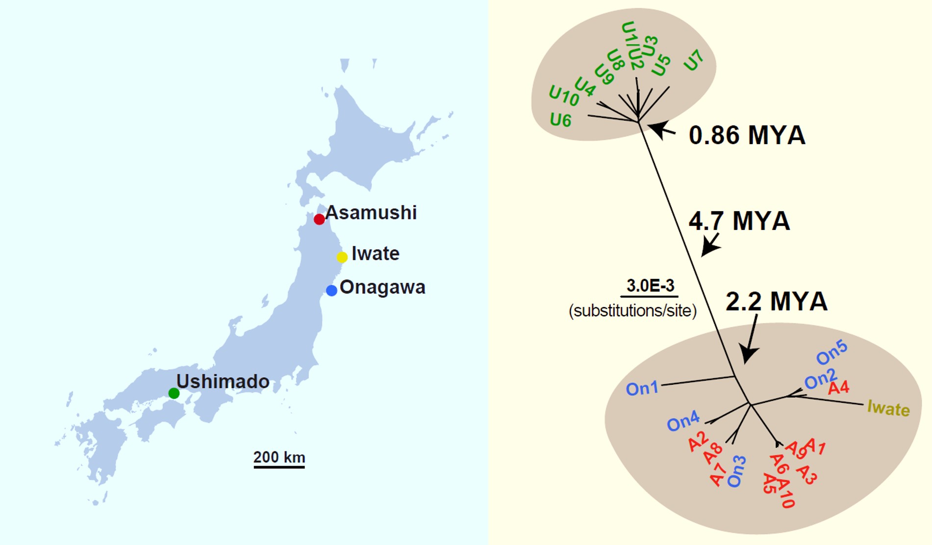 (左)マヒトデを青森(浅虫、赤)、宮城(女川、青)、岡山(牛窓、緑)から採集した。岩手(宮古、黄)は、ここから採集されたマヒトデのデータがすでに発表されておりそれも加えた。(右)2つの集団は約470万年前に分岐したと推定される。
