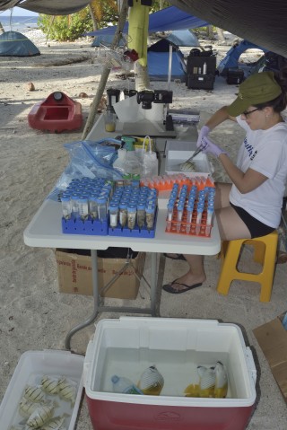 マルセラ・エレラ・サリアス博士 試料を民家に運んで保管する前にキャンプの“分子生物学実験室”で作業をするマルセラ・エレラ・サリアス博士。 画像提供: Pascal Kobeh 日付: 2023年3月8日 画像提供: Pascal Kobeh 全解像度画像をダウンロード シェア: Related Images タイアロ環礁の位置 調査チームは、飛行機を乗り継いでファカラバ空港まで移動し、そこから船に乗り換えてタイアロ環礁に向かった。ファカラバとタイアロは、共に世界最大の環礁群を持つツアモツ諸島の一部である。 空から見たタイアロ環礁 環礁とは、熱帯や亜熱帯の海底にサンゴ礁が堆積してできた環状の島であり、通常は内側にラグーンを形成している。多くのラグーンは外側の海とつながっているが、フランス領ポリネシアのタイアロ環礁のラグーンは、完全に閉じた珍しい形をしている。このラグーンの水温は周囲の海水よりも約0.5〜1.0℃高く、気候変動や進化に関する謎を解き明かす天然の実験室となっている。 画像提供: Pascal Kobeh ブイの固定 水温測定のためのブイを固定するダイバー。 画像提供: Pascal Kobeh 求愛行動から化石になるまで(イメージ図) 樹脂が木をゆっくりと流れ落ち、シロアリはその粘着性のある樹脂に閉じ込められて、やがて琥珀になるのかもしれない。