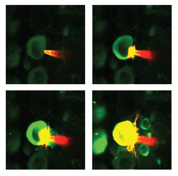 顕微鏡を見ながらプルキンエ細胞の細胞膜の横にプローブを置き、蛍光色素を注入する。 色素分子がうまく注入されれば、脳細胞の活動を観察することができる。