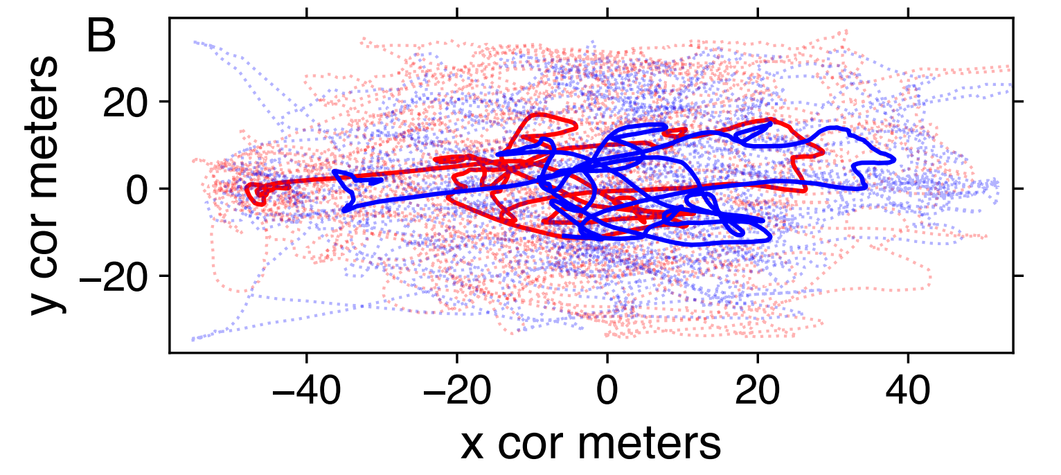 両チームの全選手の軌跡は半透明の点線で、各チームの重心の軌跡は実線で示した。試合開始から5分間を示している。赤がチーム1、青がチーム2。