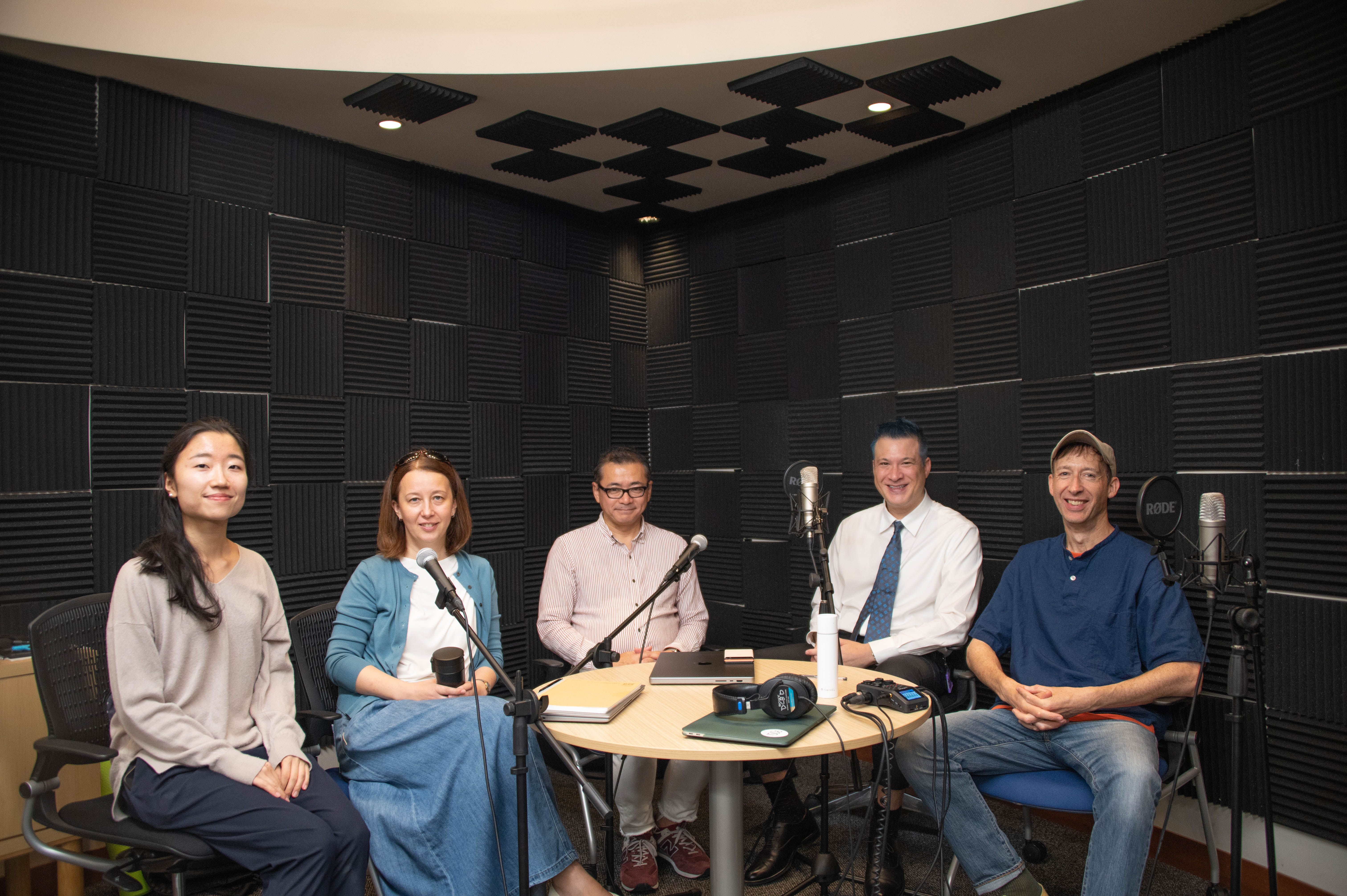 グローバル・バイオコンバージェンスイノベーション拠点のマネジメントチームとDJニック・ラスカムさん。((左から)小澤絵奈プロジェクト・アドミニストレーター、ナタリア・コシキナ研究開発プロジェクト・コーディネーター、田中康進COI事業開発ディレクター、プロジェクトリーダーのニコラス・ラスカム教授、DJニックことニック・ラスカムさん。)