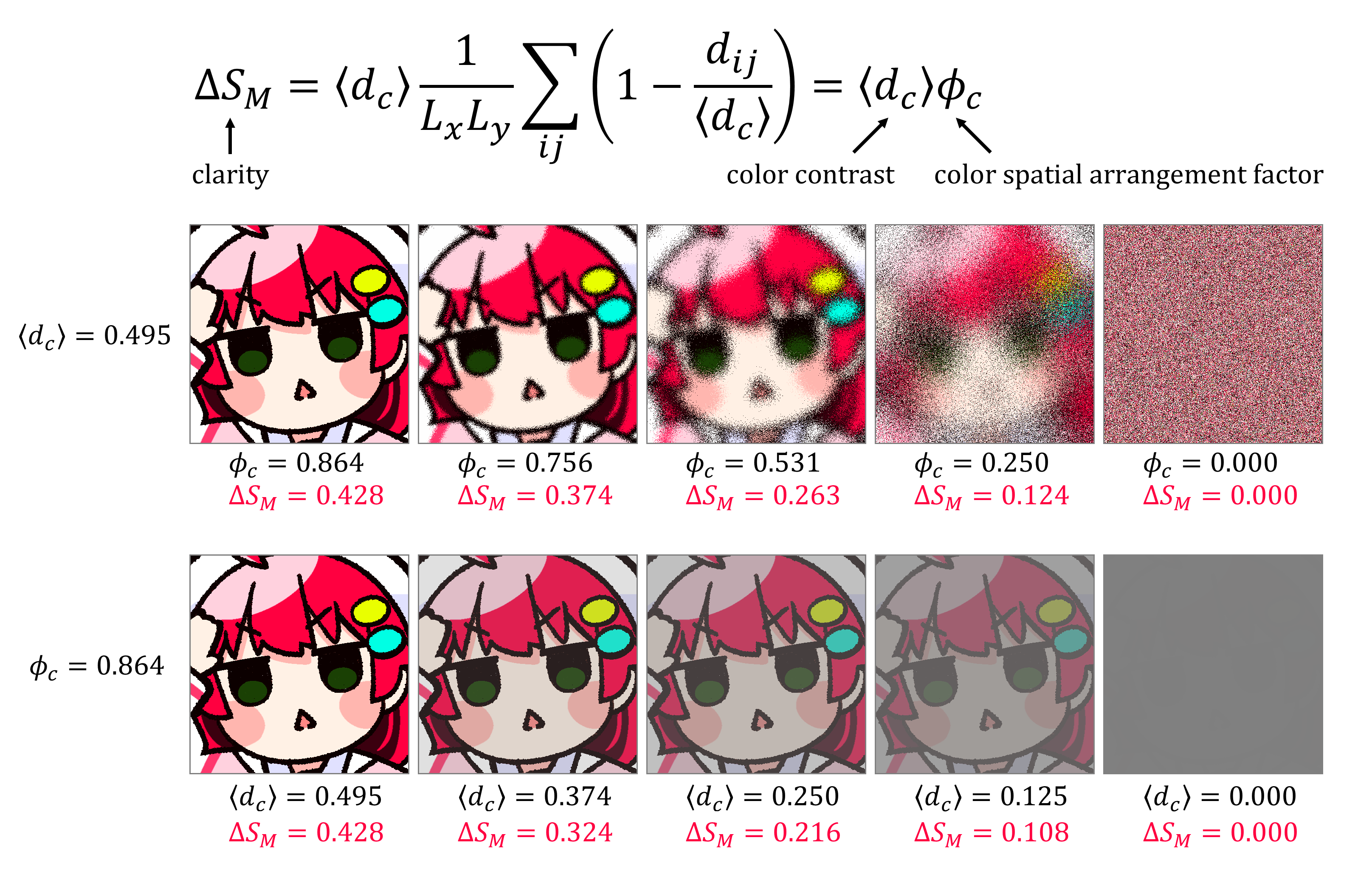 鮮明度の低下の例:ぼかしと色コントラストの影響。上段は、コントラストを一定に保ったまま、ぼかしが鮮明度に与える影響を示している。下段は、色の配置を固定したまま、コントラストの低下が鮮明度に与える影響を示している。