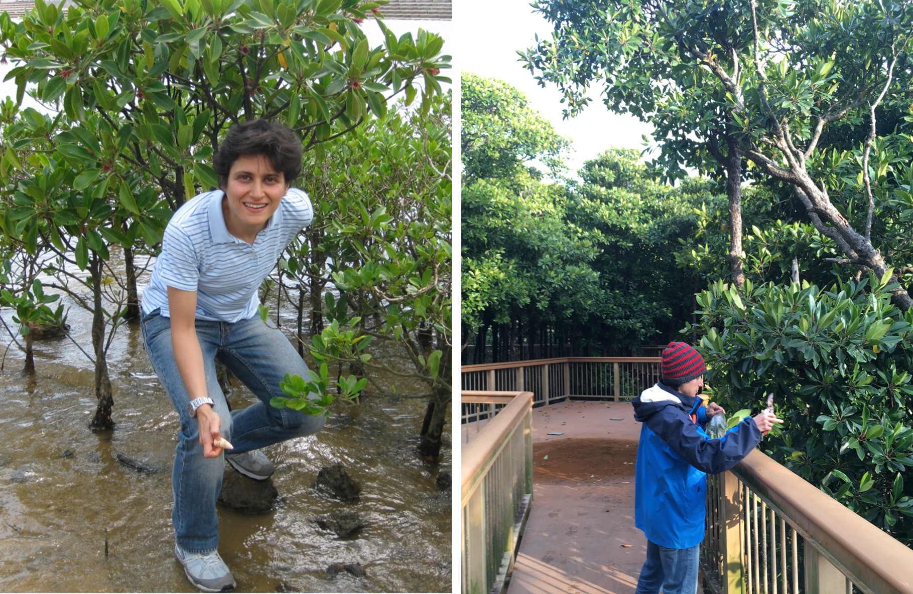 海側で生育するマングローブ (左)は高い塩分濃度にさらされ、樹高が低く、河川側のマングローブ (右)は塩分濃度が低い汽水域にあり、樹高が高く、幹が太く、葉も大きい。これらの木の調査は、マティン・ミリェガネ博士(写真)のチームによって行われた。