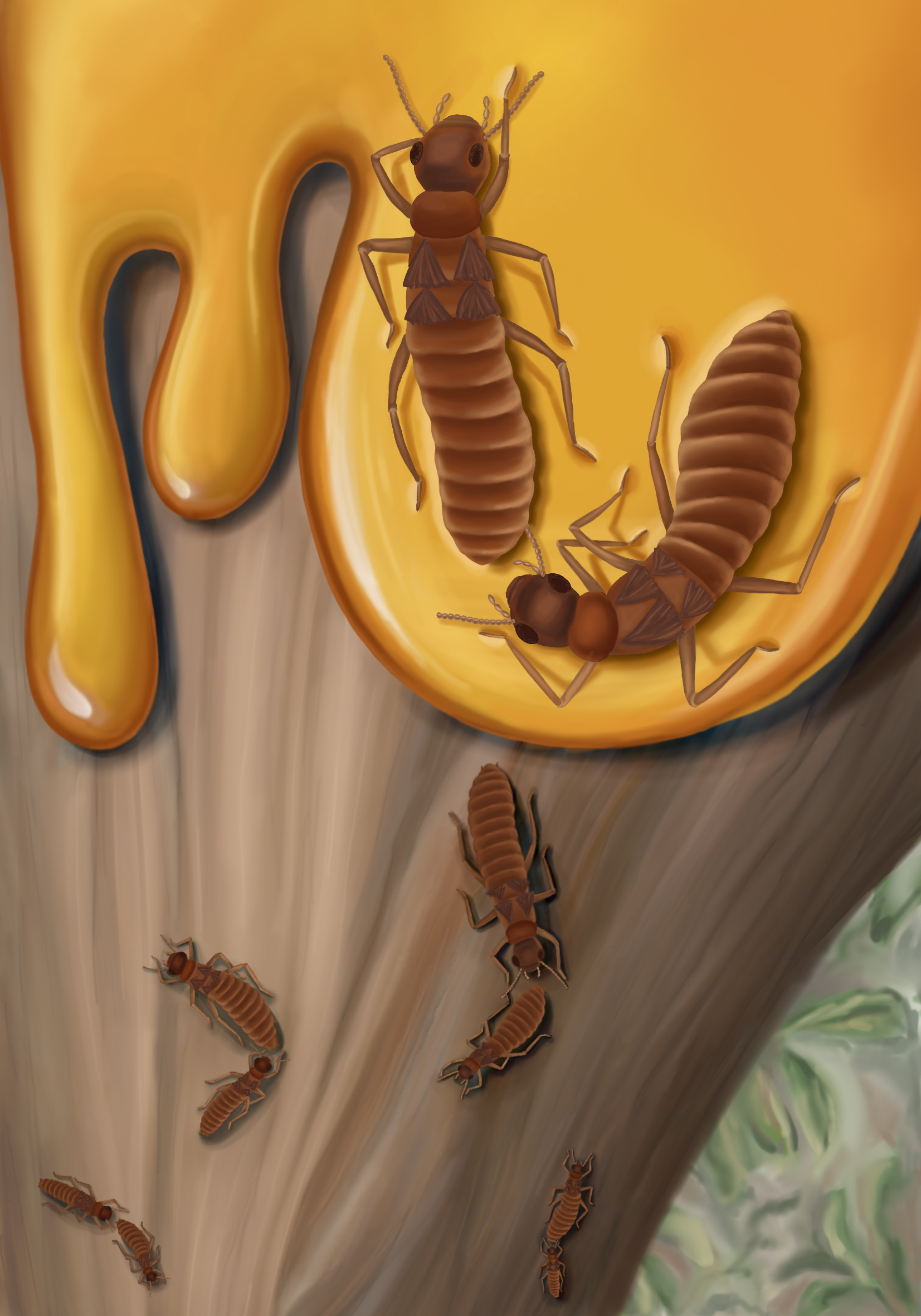 樹脂が木をゆっくりと流れ落ち、シロアリはその粘着性のある樹脂に閉じ込められて、やがて琥珀になるのかもしれない。