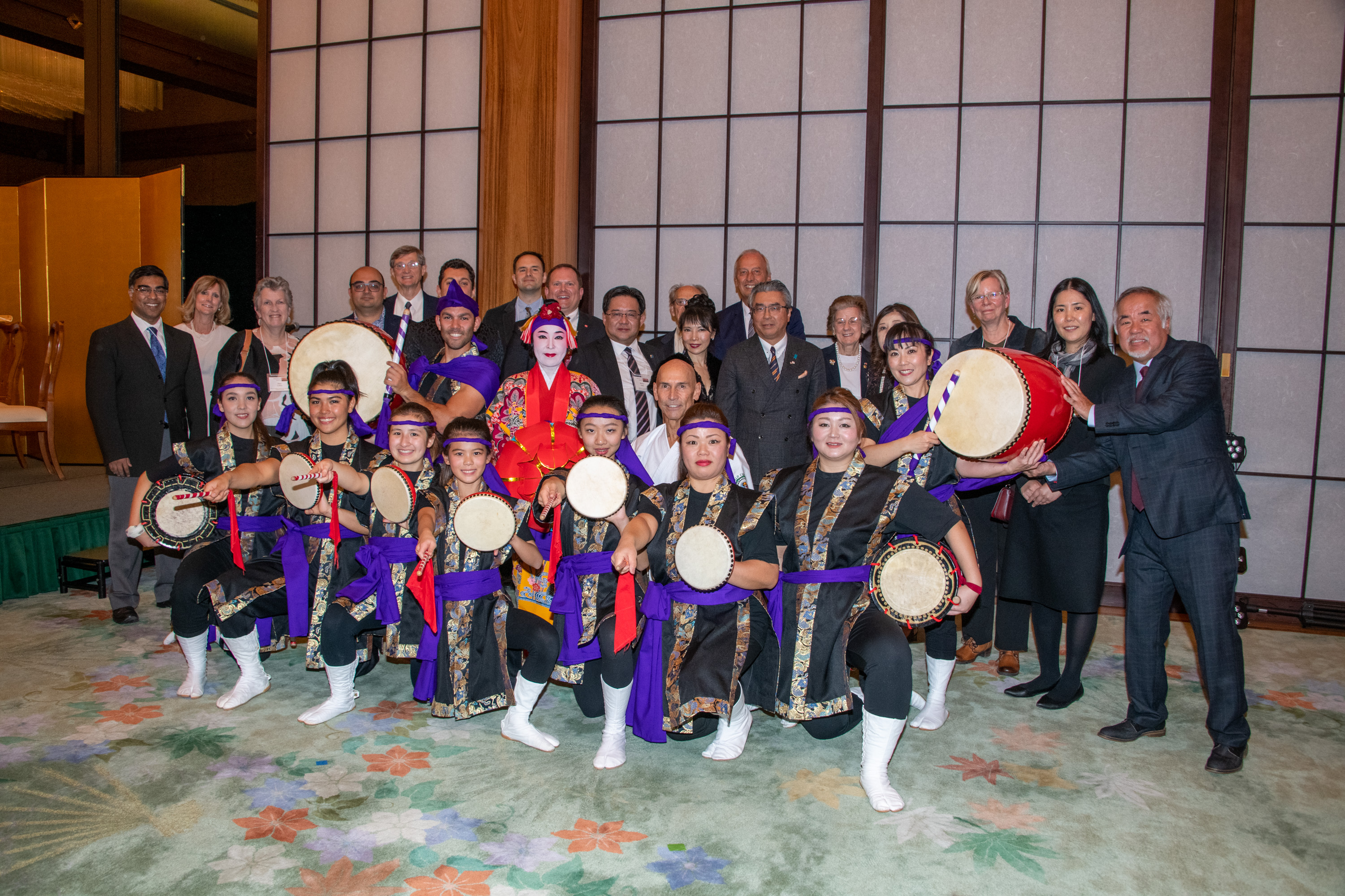 OIST財団設立記念式典で沖縄伝統芸能を披露してくださった皆さんとの記念写真。