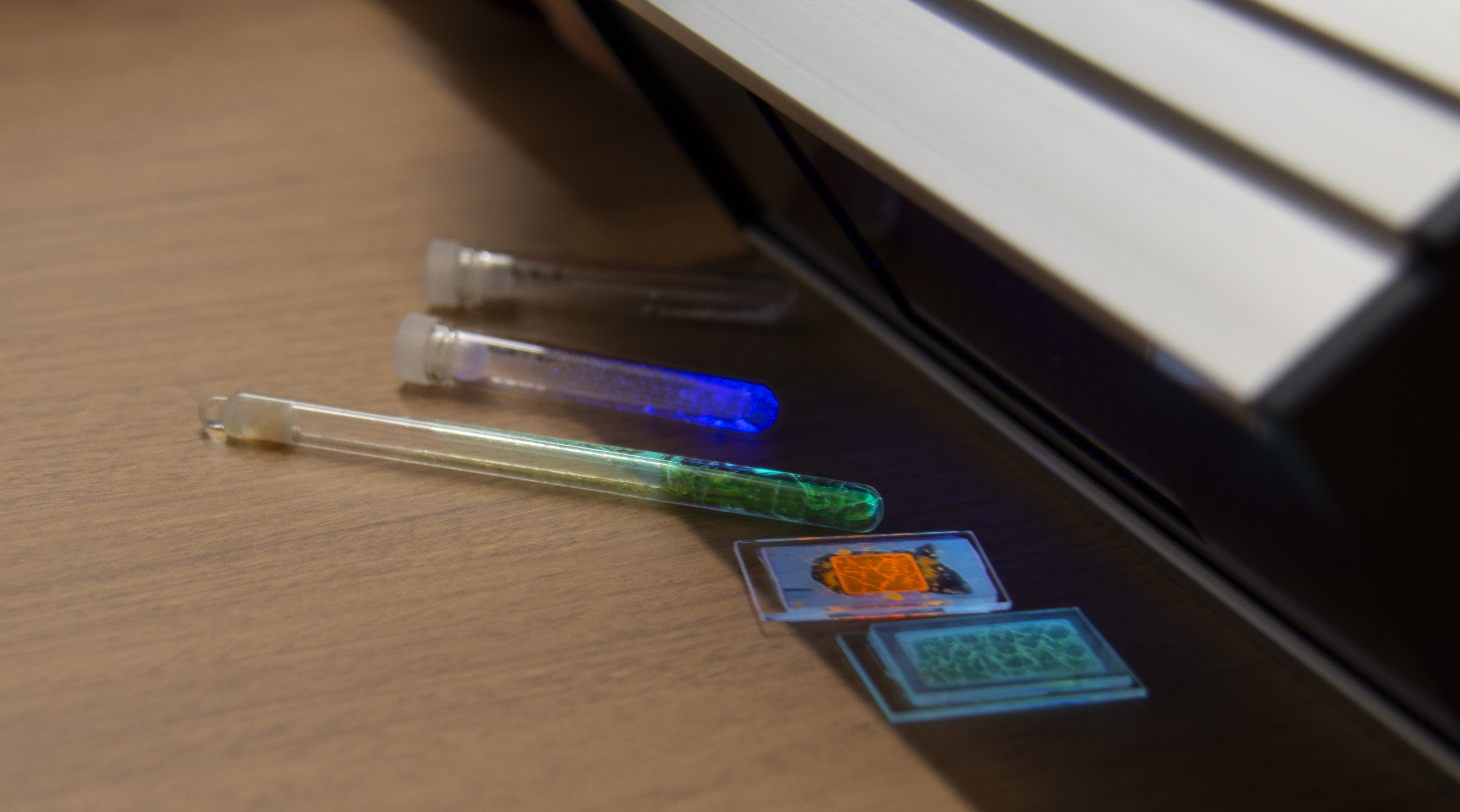 嘉部准教授は、異なる分子を混ぜ合わせることにより、有機材料から緑やオレンジなどさまざまな色をつくり出した。