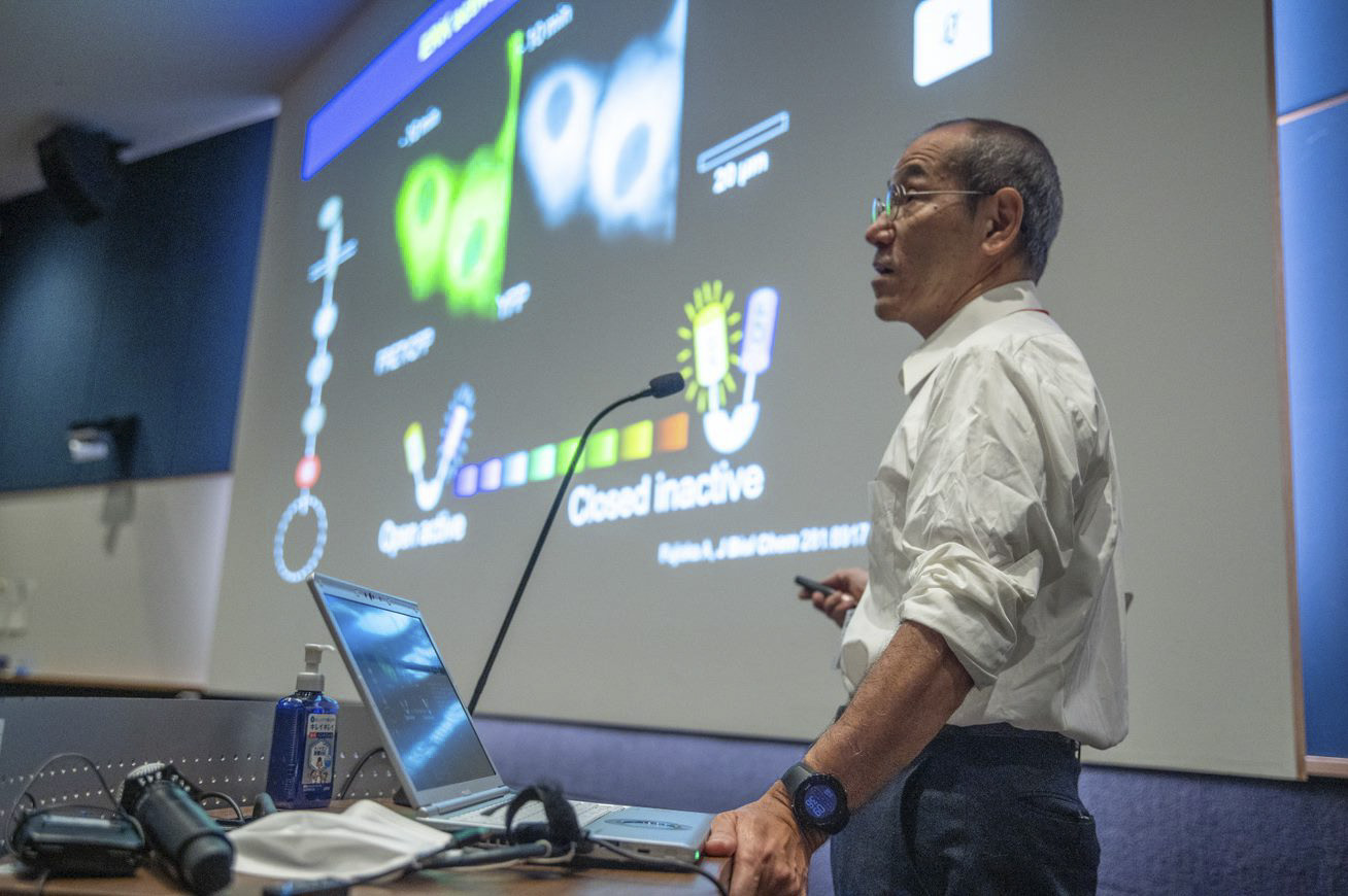 「Challenges in Biomedical Complexity(生物医学的複雑性の課題)」のテーマで行われた OIST-Kyoto University Joint Workshopで成長因子の伝達に関する研究成果を発表する京都大学の松田道行教授。