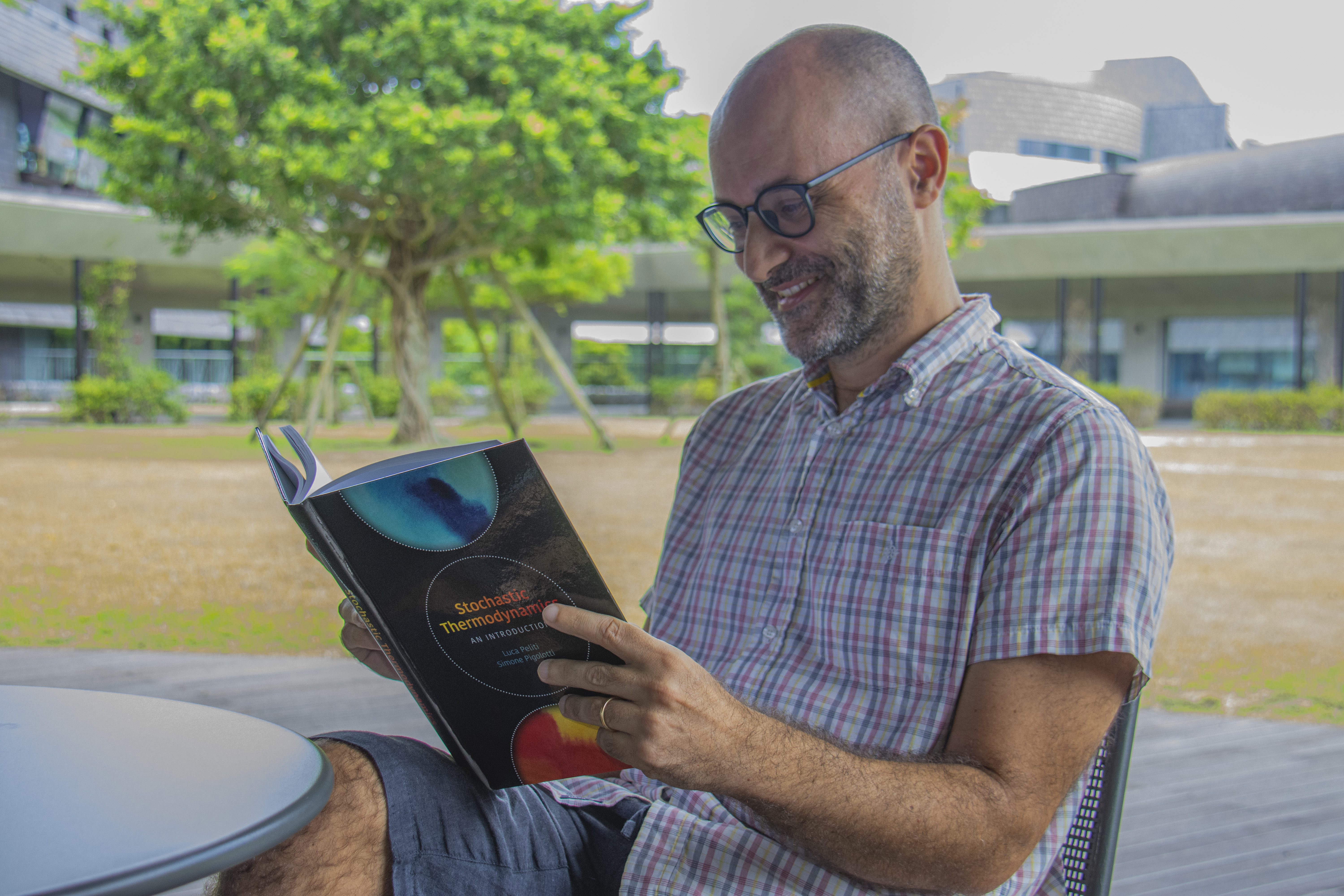 新たに出版された教科書「Stochastic Thermodynamics, An Introduction」を披露するシモーネ・ピゴロッティ准教授。