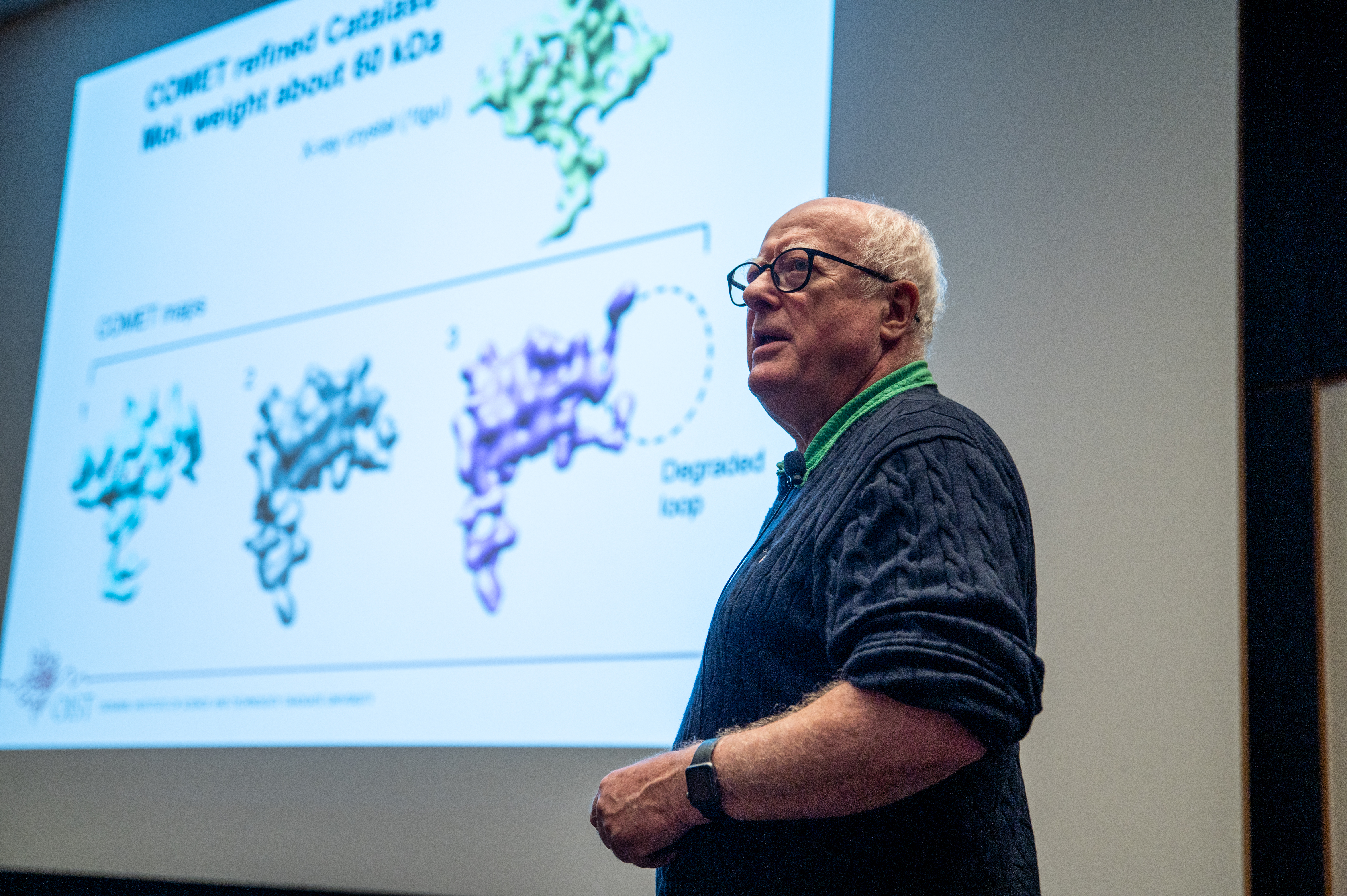 プロボスト主催の講演会で、OISTの研究者や学生、スタッフを前にタンパク質の断層撮影の研究について説明するウルフ・スコグランド教授