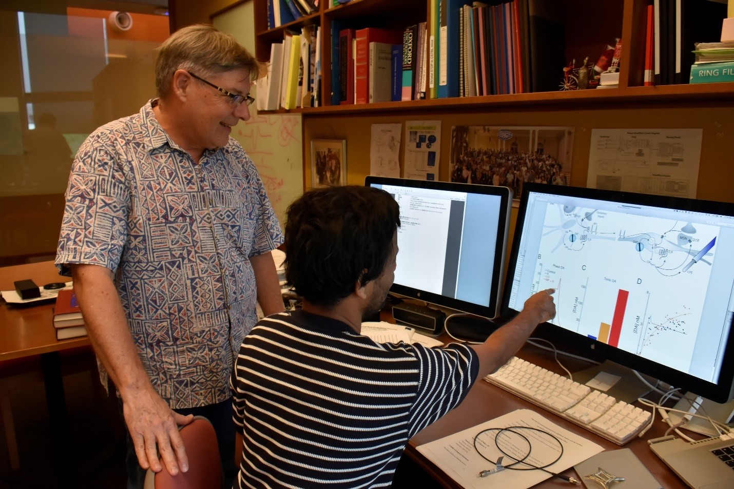 ラットの脳におけるドーパミン放出を調べる実験データを考察するジェフ・ウィッケンス教授とカビンダ・リヤナガマ技術員