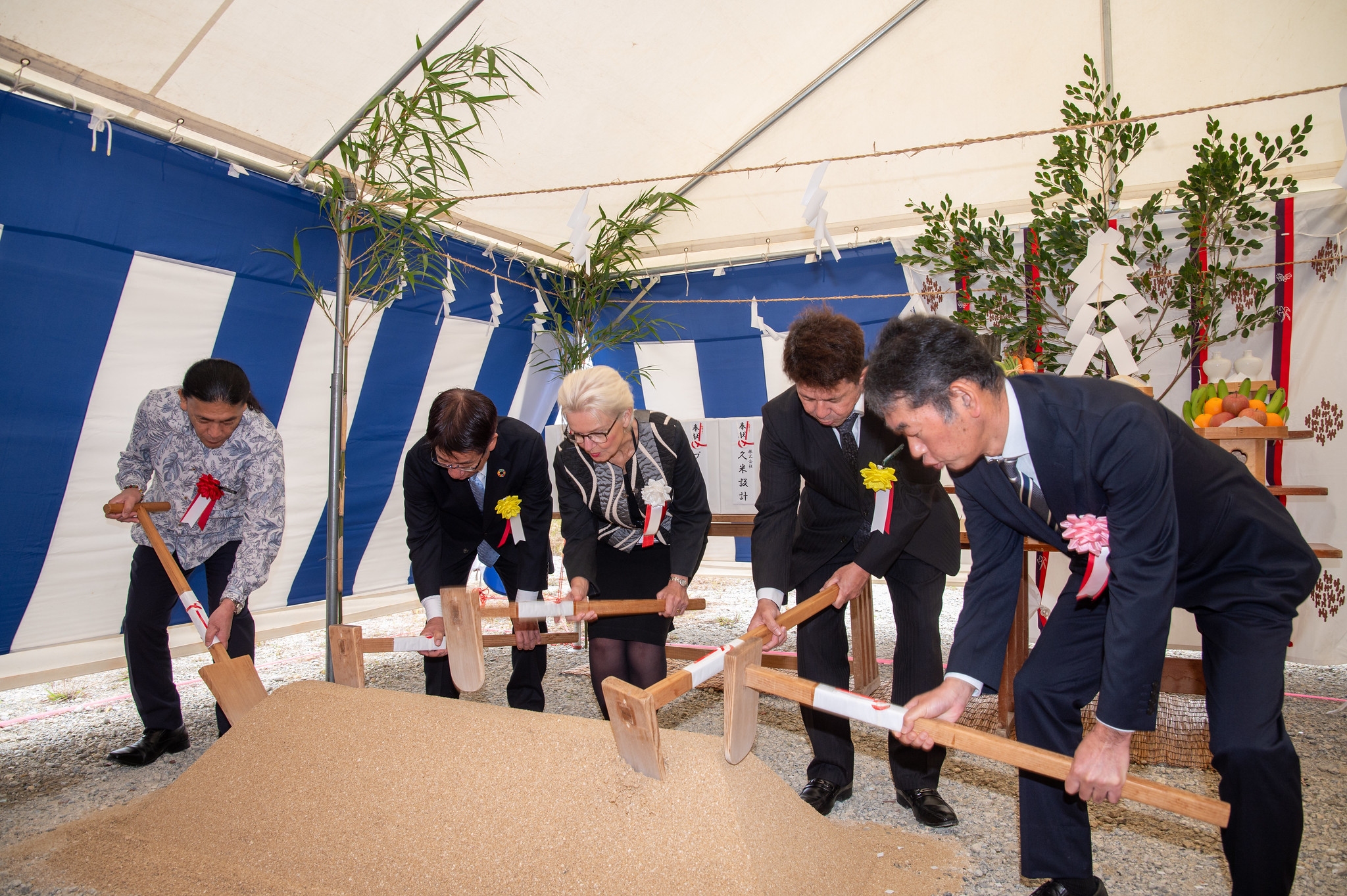 スタートアップ・インキュベーション施設2棟の起工式で、鍬入れの儀に参加するOIST、恩納村、建設会社の代表者ら。(写真左から)株式会社 野原建設 代表取締役 上地 修氏、恩納村長 長浜 善巳氏、OIST学長兼理事長 カリン・マルキデス博士、恩納村 谷茶区長 石川 要氏、株式会社 久米設計 九州支社 支社長 永野 孝之氏。写真提供:ジェフリー・プライン(OIST)