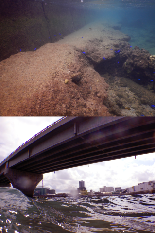 沖縄県の水釜(上)や浦添(下)のような開発が進んだ地域でも、ルリスズメダイを見つけることができる。