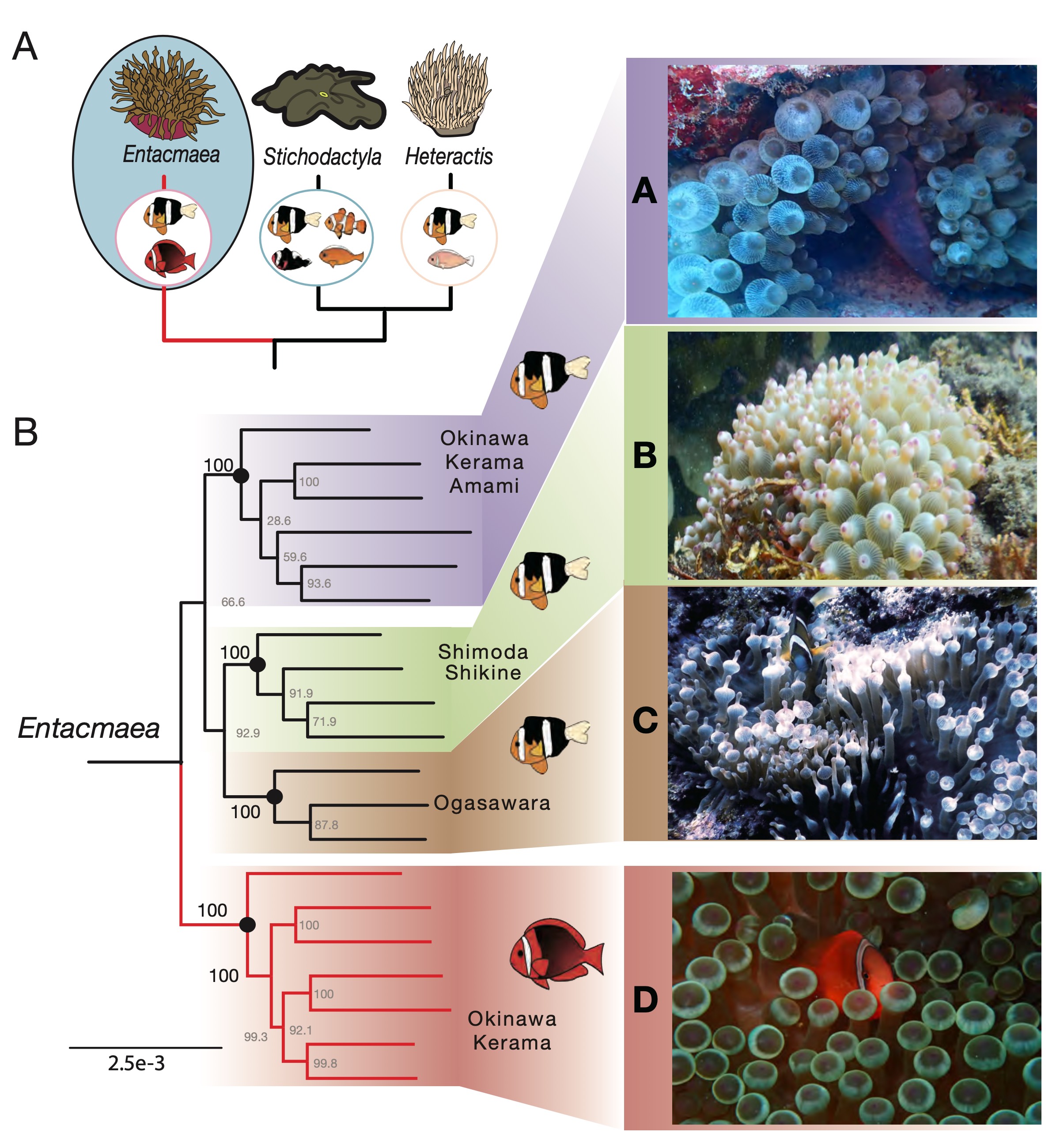 宿主イソギンチャクの3つの主要系統(A)とEntacmaea属の4つのグループの系統樹とクマノミとの関係(B)