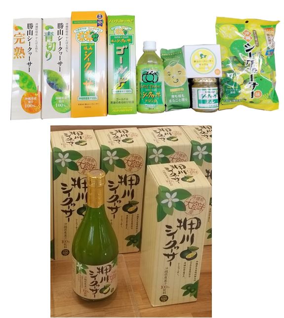 沖縄経済において重要な特産品であり、様々な製品に利用されているシークヮーサー。県内では、大宜味村と名護市勝山が最大の生産地となっている。写真(上):名護市勝山産の製品。出典:有限会社勝山シークヮーサー 。写真(下): 大宜味村産の製品。 出典:住秀和