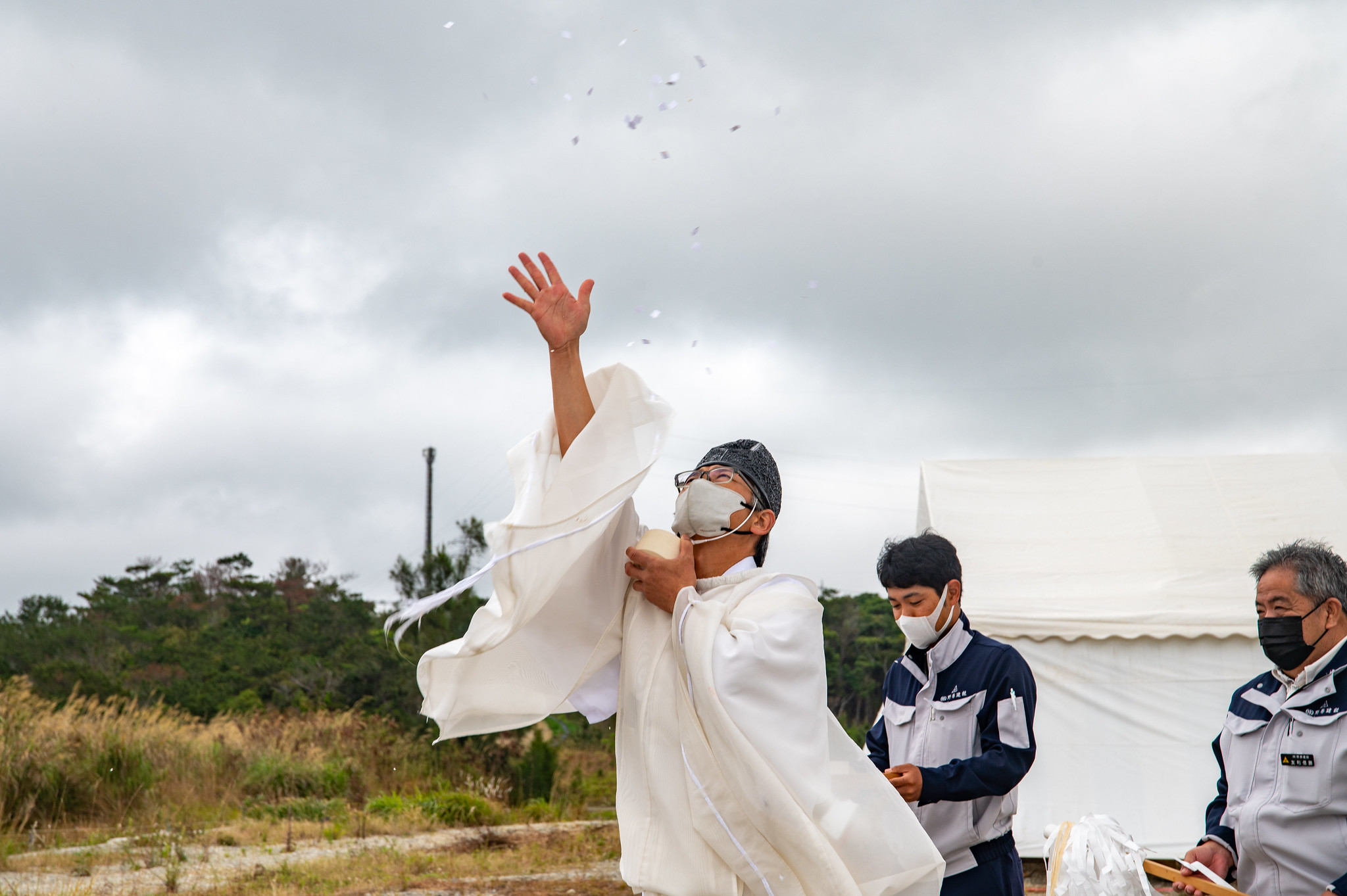 スタートアップ・インキュベーション施設2棟の起工式で、神職が建設予定地でお祓いを行い、プロジェクトの成功を祈願した。 写真提供:ジェフリー・プライン(OIST)