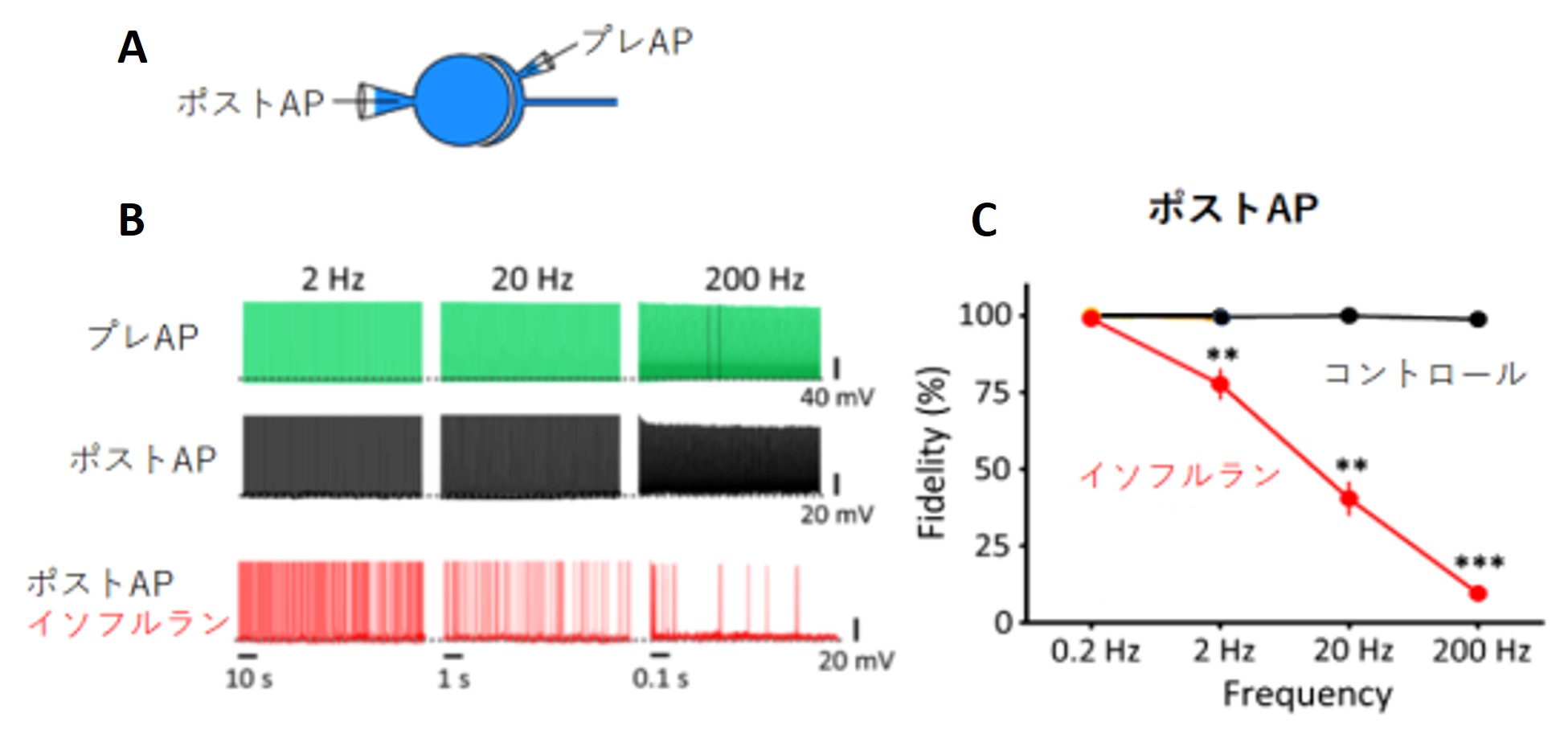 図3 ラット脳幹スライス、カリックス・シナプスにおける麻酔薬の作用