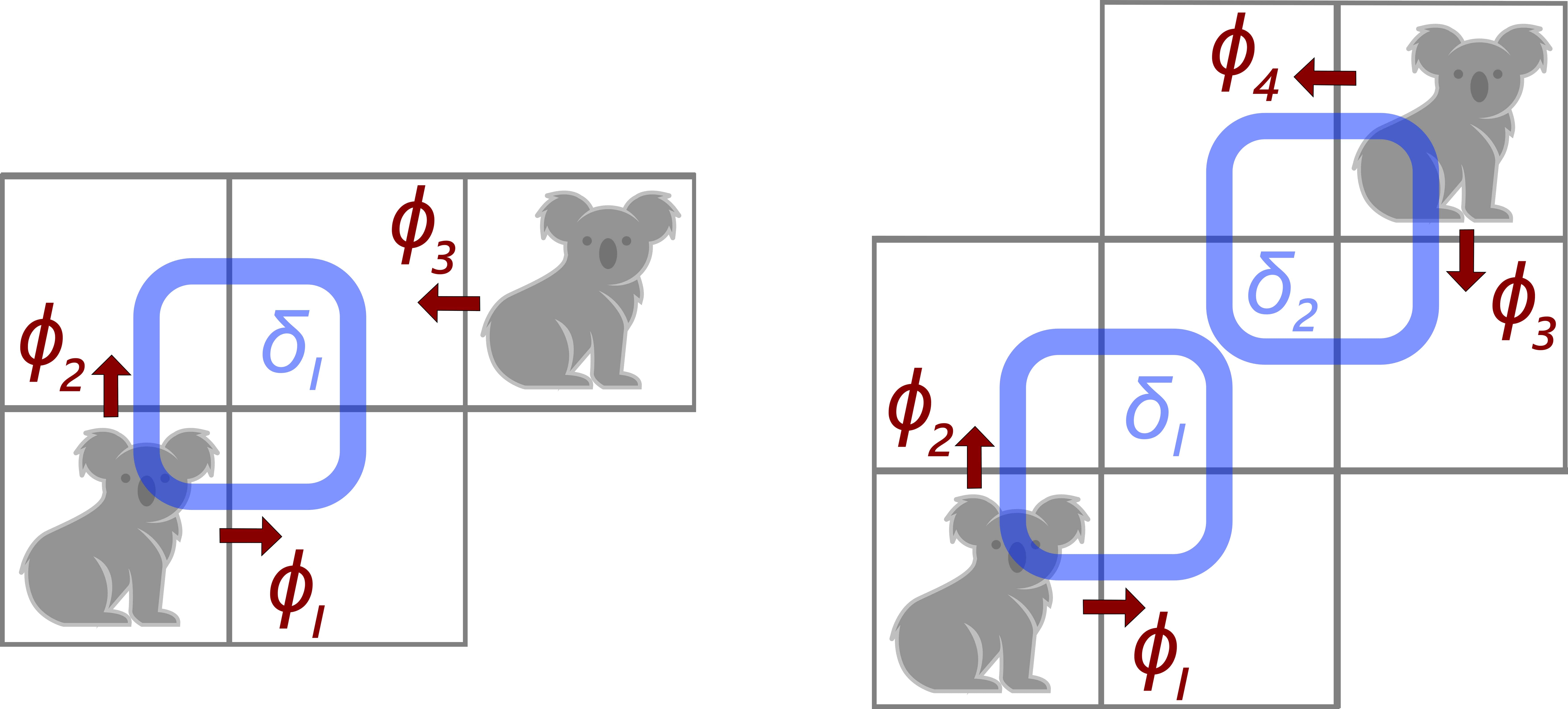 複数のエージェントが存在するグリッド世界において、グロモフのリンク条件が失敗につながる二つの状況。ナイトの移動(左)とビショップの2段階の移動(右)。えび茶色の矢印は許容される動きを示し、青い四角は許容される「ダンス」を示す。グリッド世界におけるダンスは、4マスの形での四つの動きで構成される。エージェントは相手のダンスを中断することもできるし(左)、二つのダンスが対角線上で衝突することもある(右)。