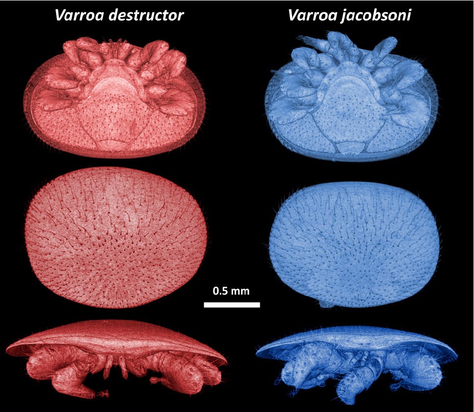 OIST生態・進化学ユニットの研究者たちがマイクロCTスキャンを利用して撮影したバロアダニ。バロアダニはミツバチのコロニーを脅かす存在。