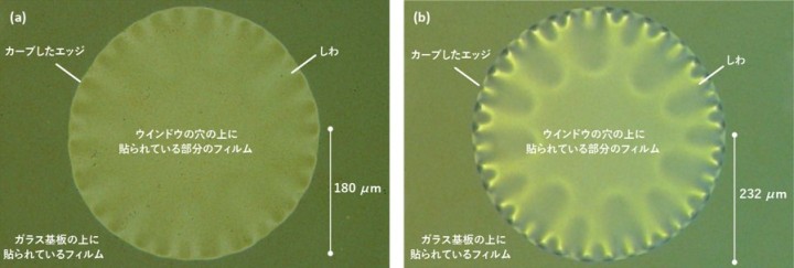 キャプション:ダイヤモンドウィンドウのしわは、ダイヤモンド層とガラス層の応力によって引き起こされる。 画像bのダイヤモンドウィンドウよりもサイズの小さい画像aのダイヤモンドウィンドウは、しわの密度が高くなっている。